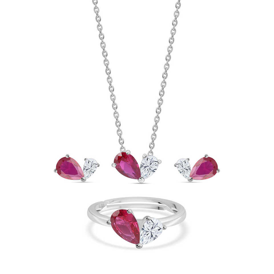 ชุดเครื่องประดับเพชรทับทิม Toi et Moi สำหรับผู้หญิงสีทองคลาสสิกและสีโรสโกลด์ชุบด้วยเพชรเพทายสำหรับงานแต่งงานและงานปาร์ตี้