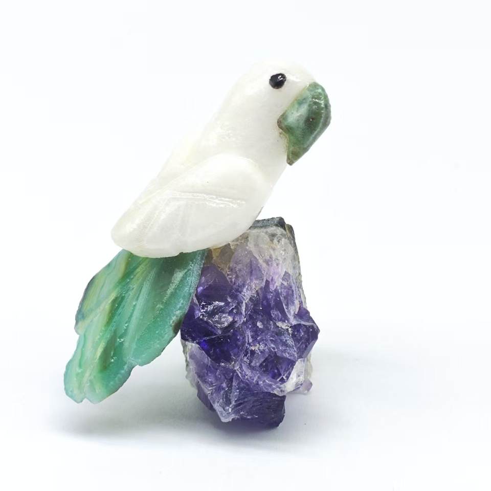 รูปแกะสลักนกแก้วจากหินรูบี้โซไซต์/แคลไซต์สีขาว/ไครโซเพรส/อะเมทิสต์