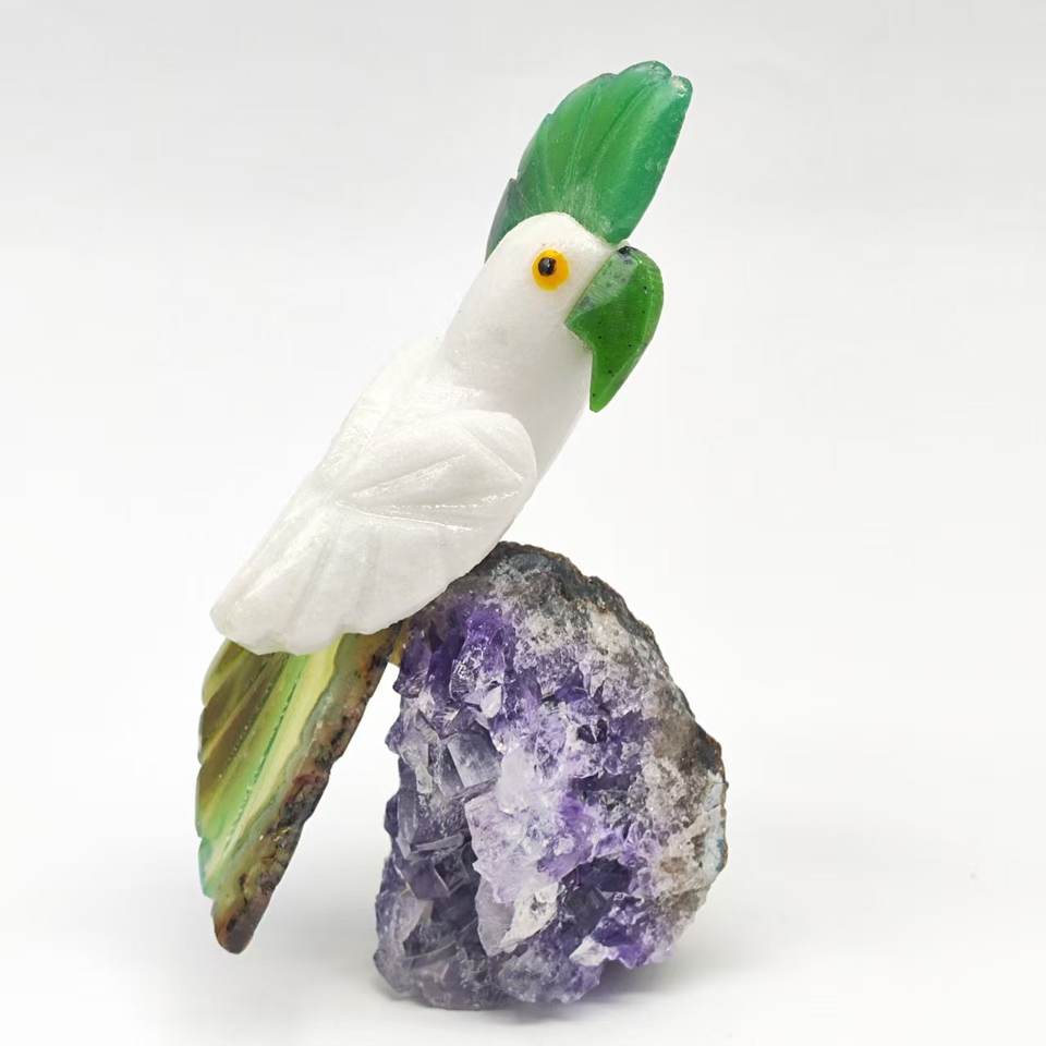 รูบี้โซไซต์/ไวท์แคลไซต์/ไครโซเพรส/อเมทิสต์ แกะสลักนกแก้วขนาด M รุ่น BJ2628