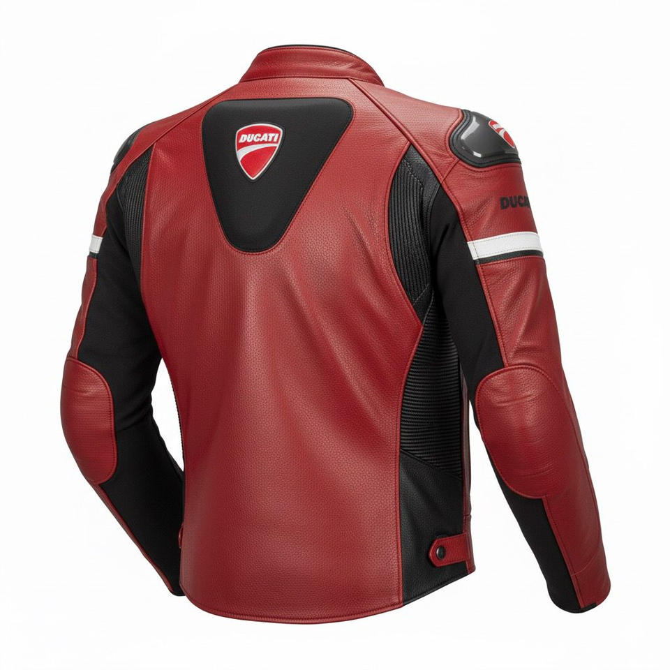 Rucati แจ็กเก็ตหนังสำหรับแข่งรถมอเตอร์ไซด์สีแดงออกแบบได้ตามต้องการหนังวัว/จิงโจ้ผลิตขึ้นมาเพื่อวัดความเร็วในการขับขี่