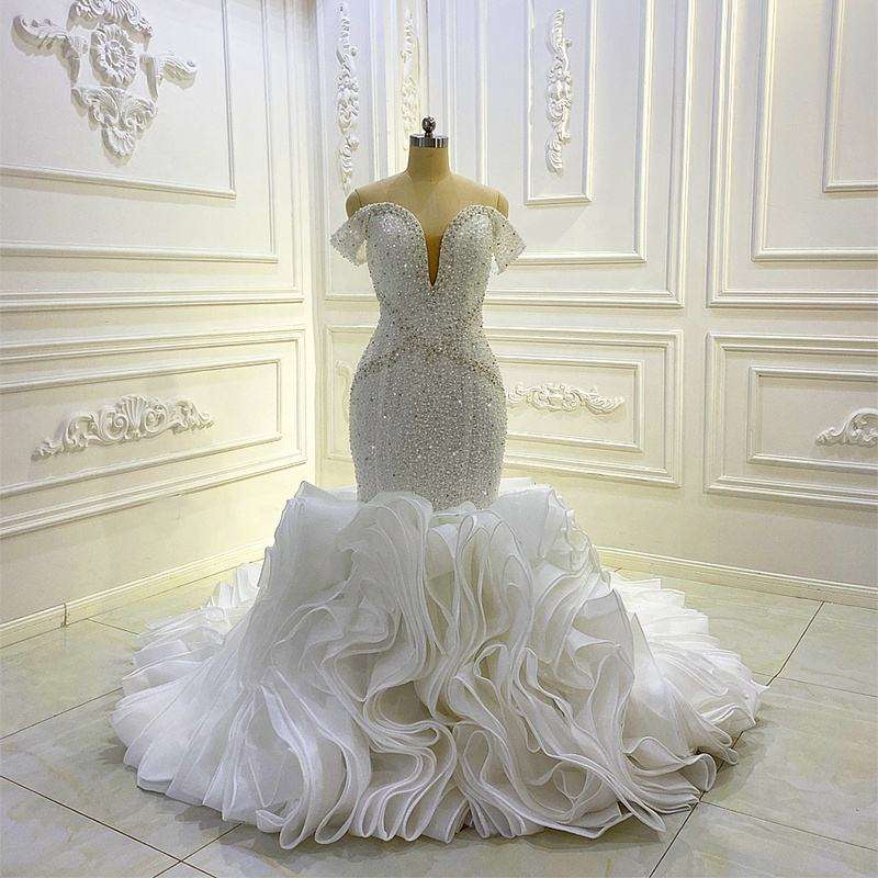 ชุดเจ้าสาวไข่มุกเปิดไหล่มีระบายชุดแต่งงานนางเงือกยังไม่มีคำวิจารณ์