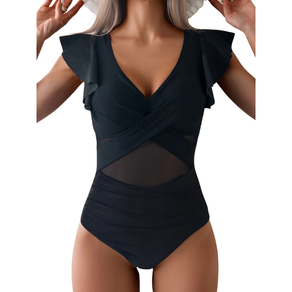 ชุดว่ายน้ำวันพีซสำหรับผู้หญิง แขนระบาย คอวี ผ้าเนื้อนุ่ม ยืดหยุ่น ดีไซน์เรียบง่าย เหมาะสำหรับใส่ไปรีสอร์ท