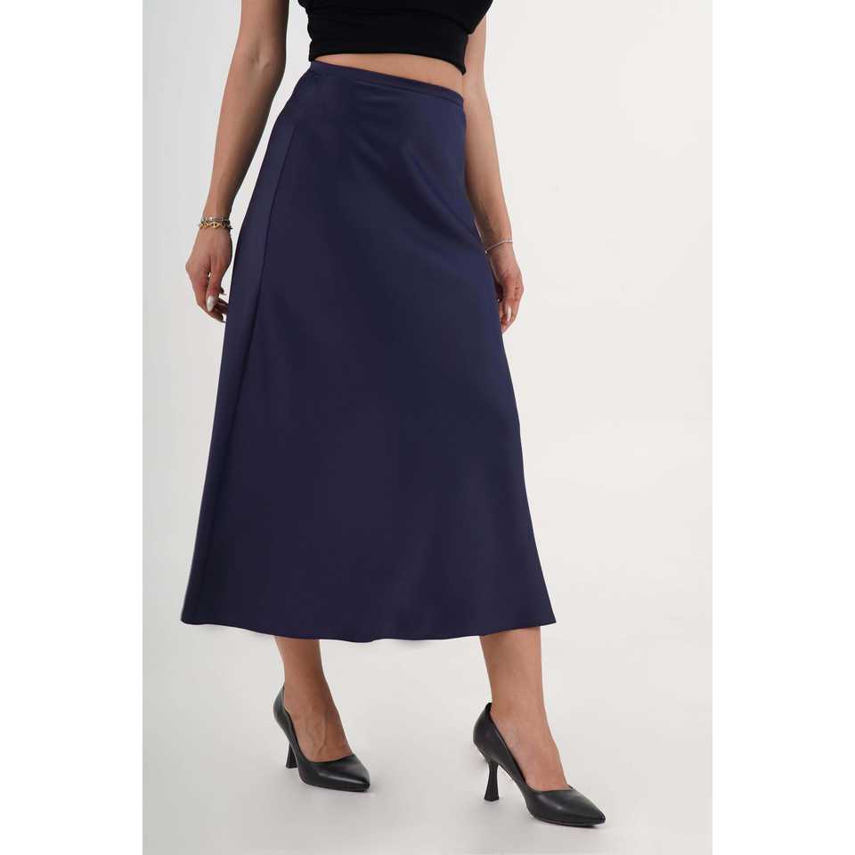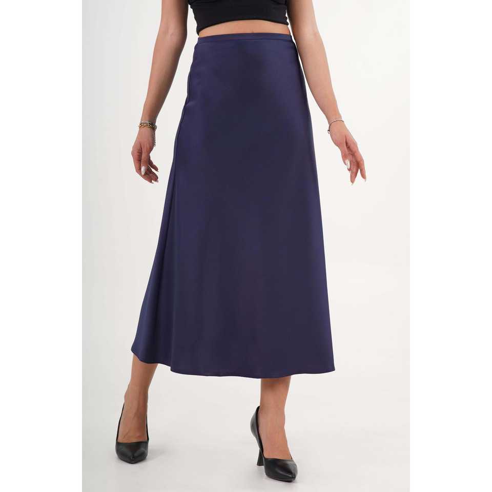 กระโปรงผ้าซาตินสีน้ำเงินกรมท่าทรงเอไลน์ยาวปานกลาง แต่งระบาย ขอบผ้าตัดแต่ง ผ้าไหมแท้ 100% เงางาม สำหรับผู้หญิง