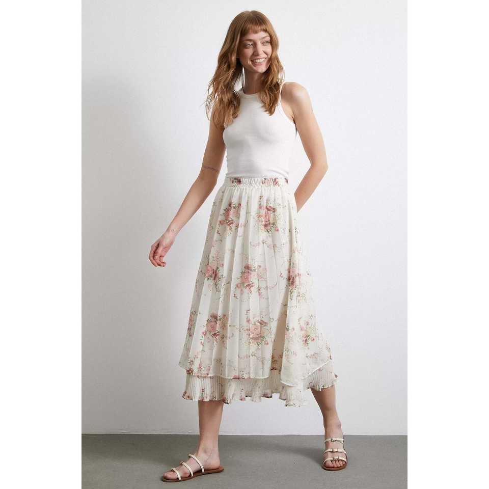 กระโปรงจีบระบายผู้หญิงผ้าชีฟองเอวยางยืดพิมพ์ลายดอกไม้นุ่มสีครีมความยาวปานกลาง