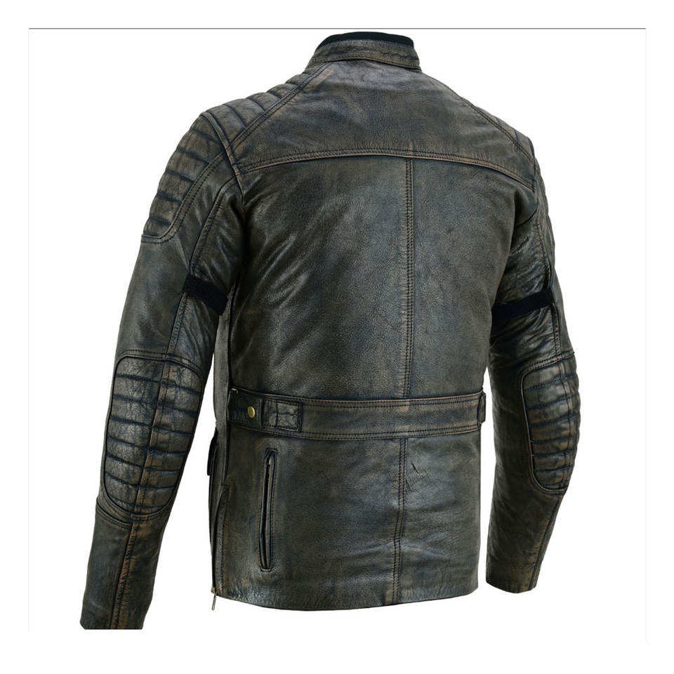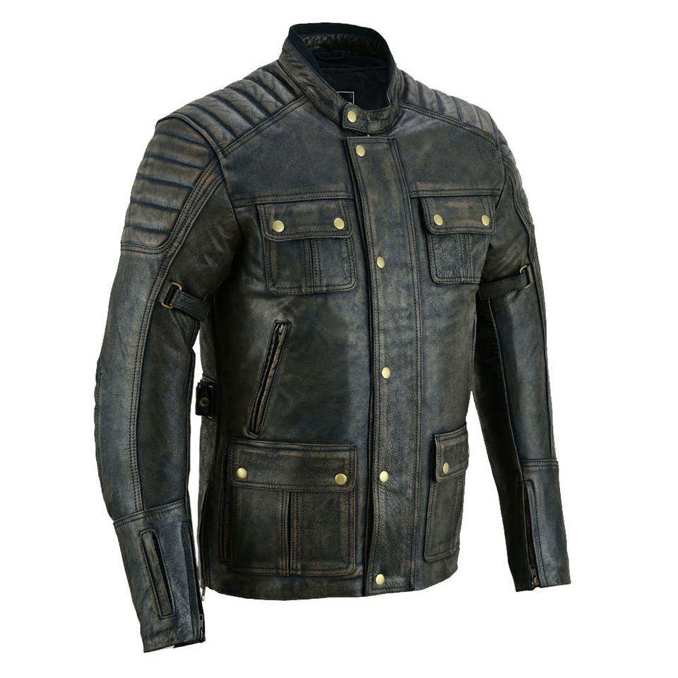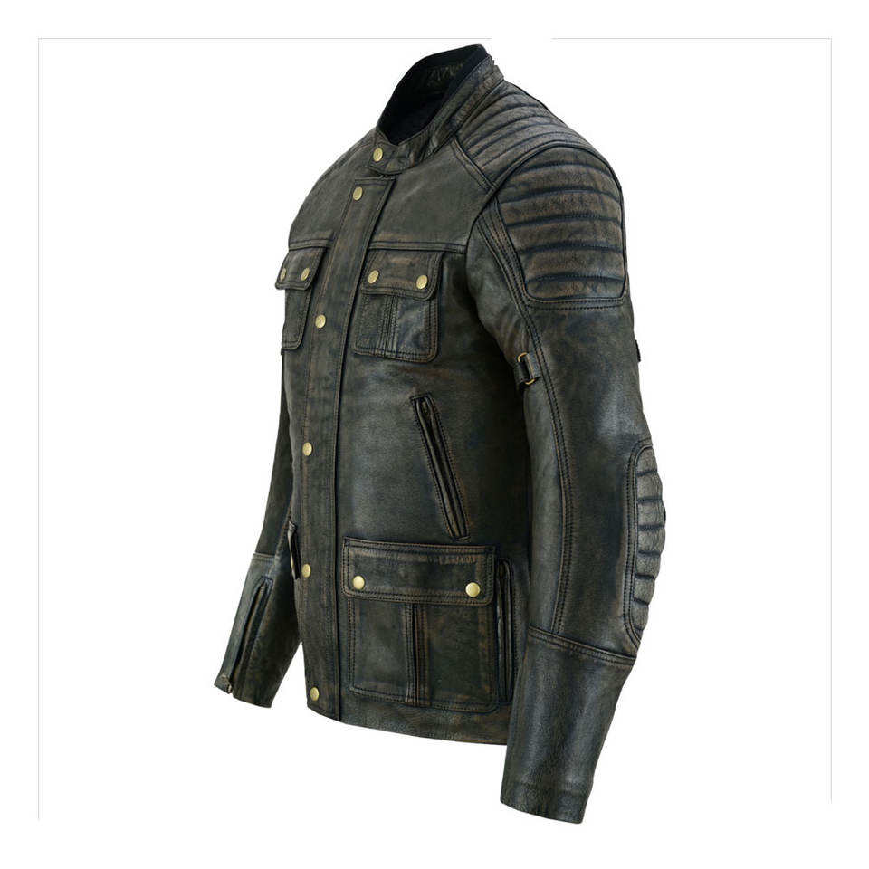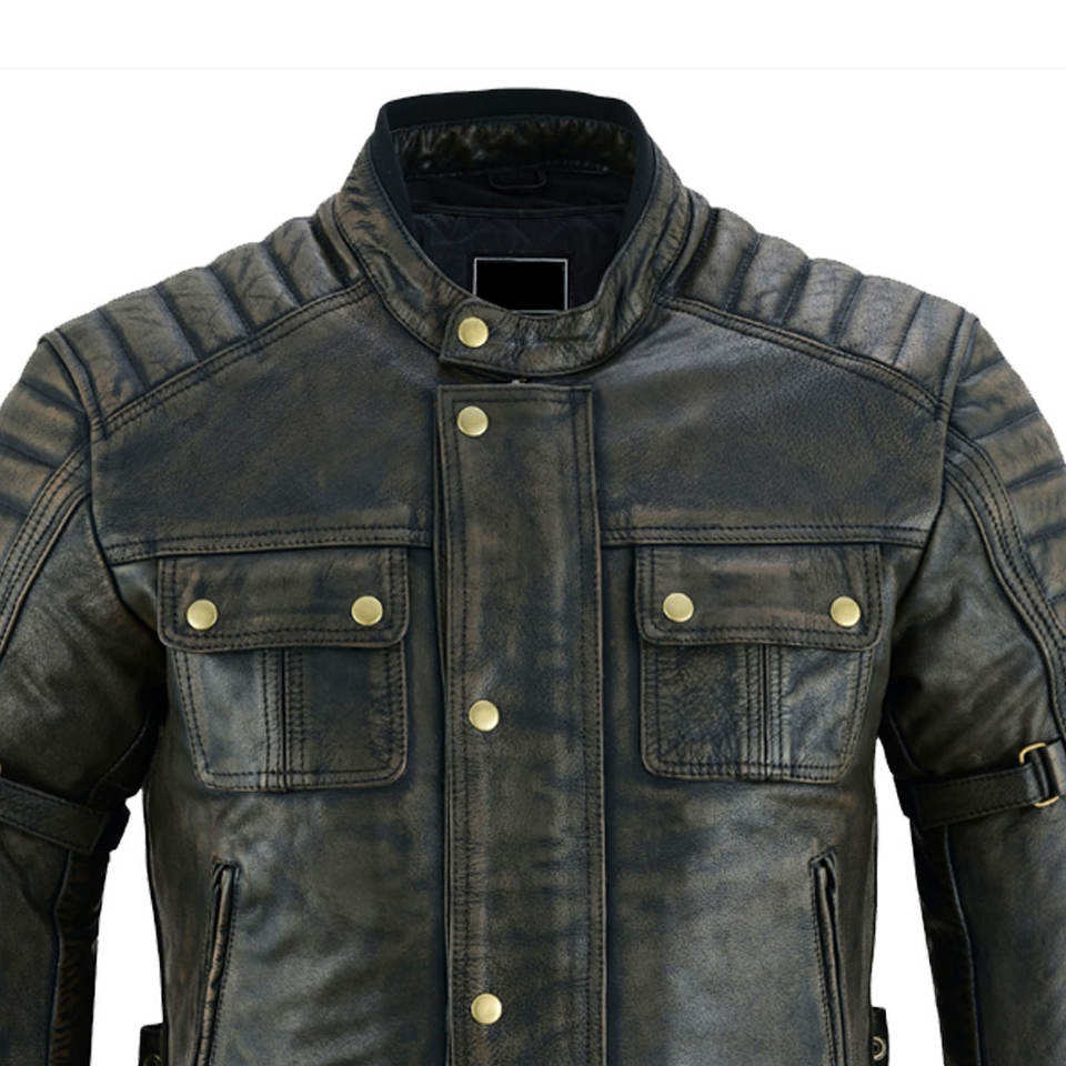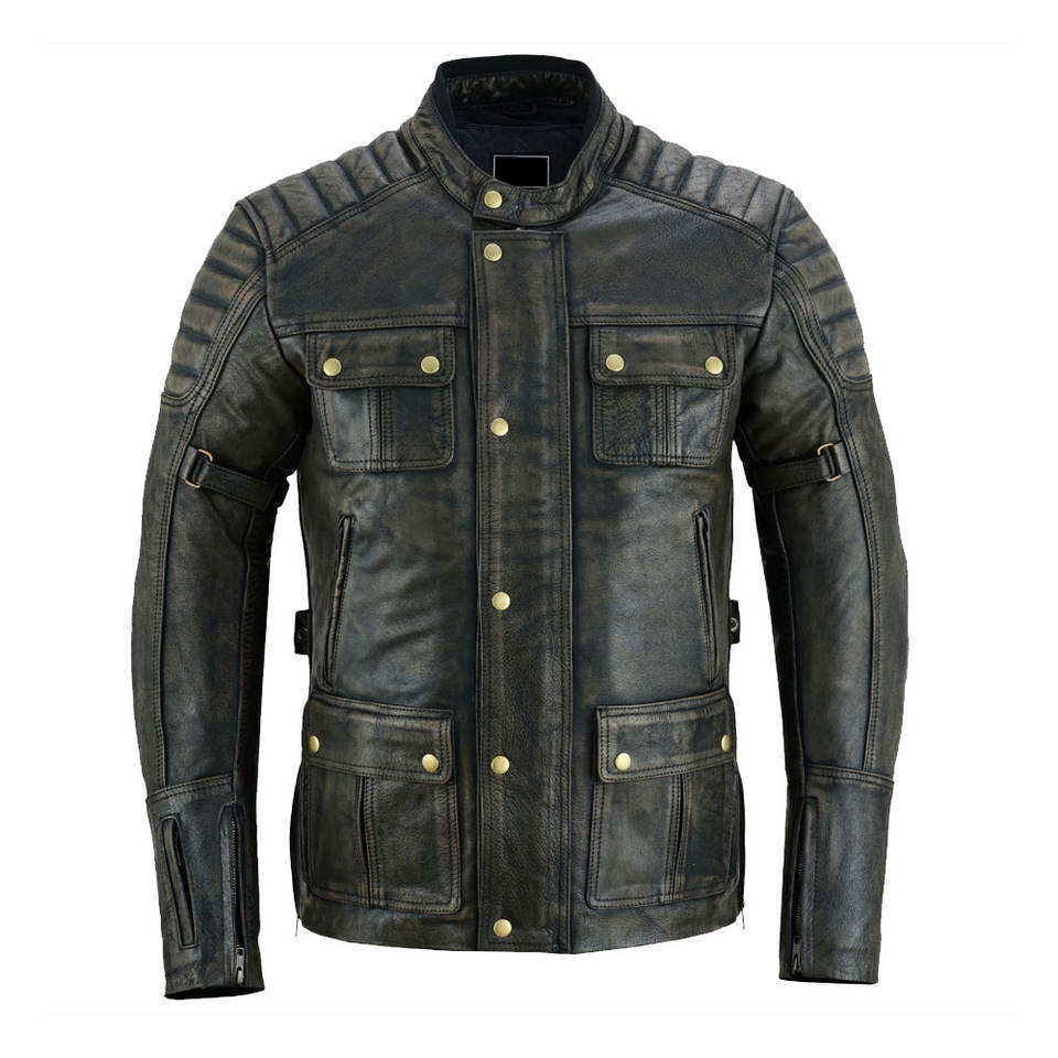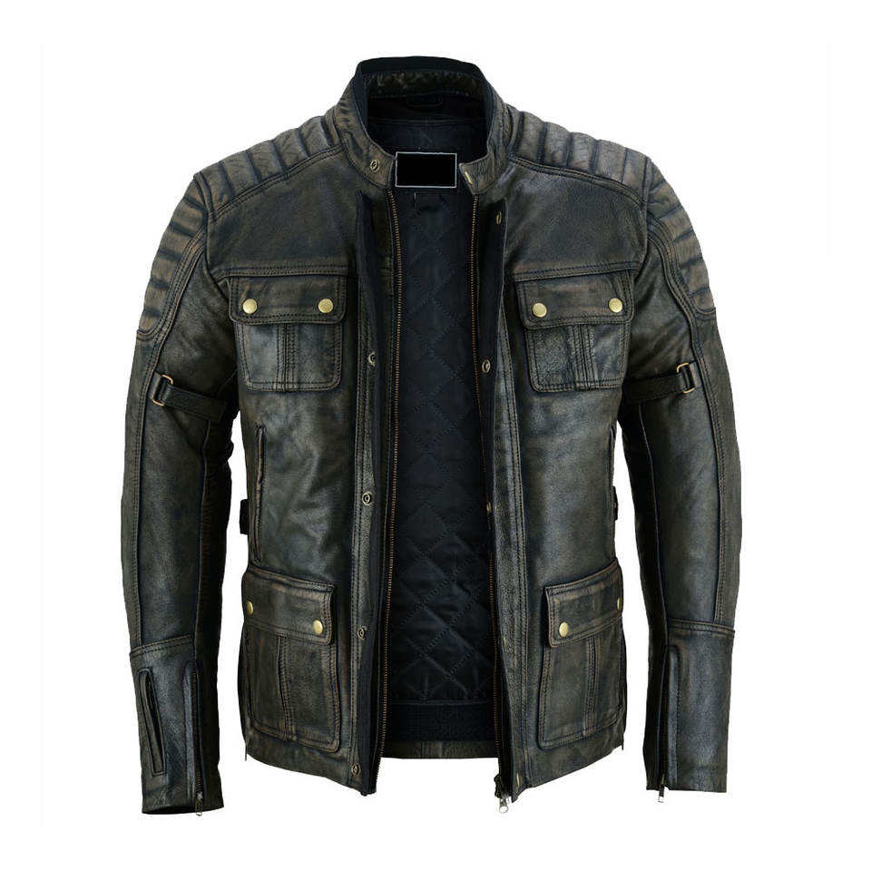 แจ็คเก็ตหนังฟอกแบบทนทานหลายกระเป๋า - หนังแกะแท้แบบดิสเทรส - แจ็คเก็ตไบค์เกอร์สไตล์ยุทธวิธีเคลือบแว็กซ์