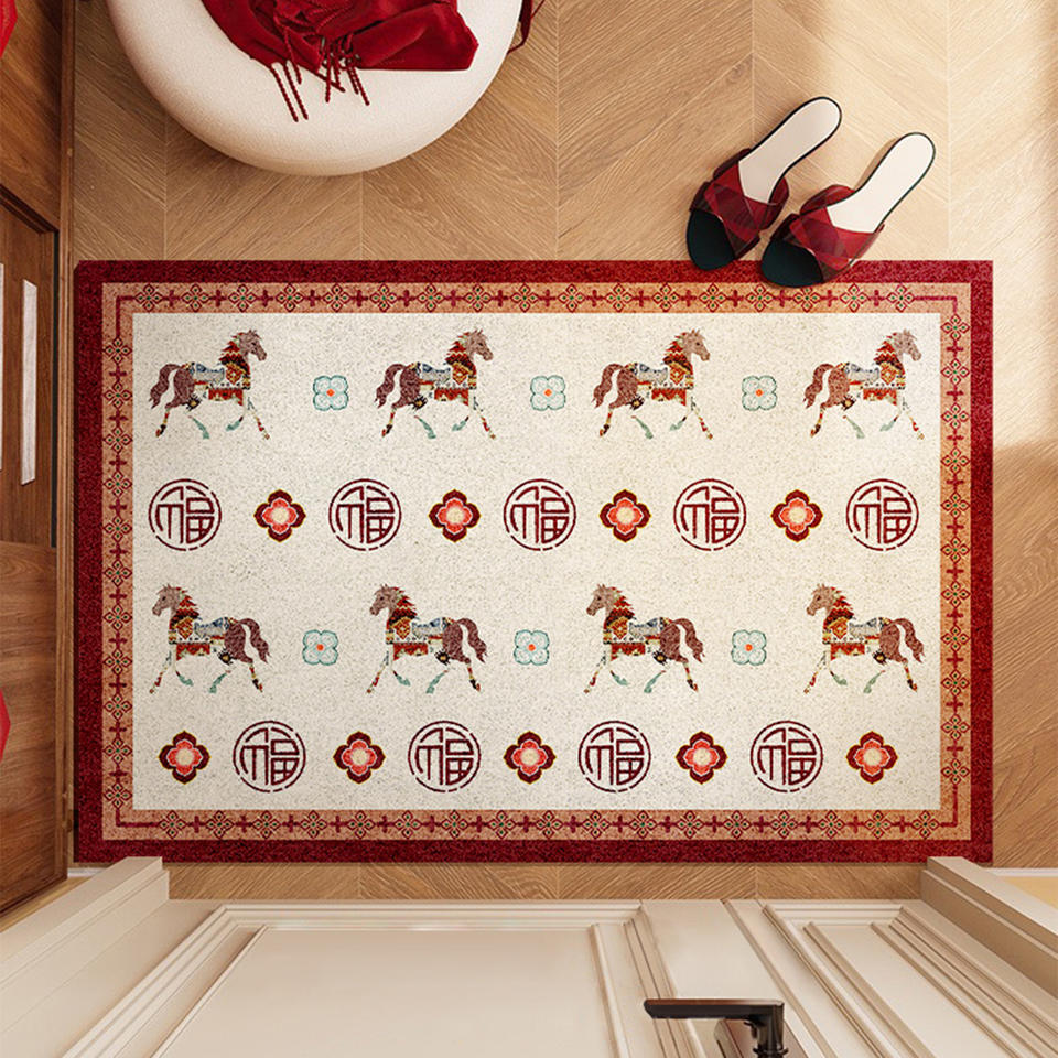 พรมเช็ดเท้าลายม้ารุ่ยเหวิน ฟูมะ รูปทรงสี่เหลี่ยมผืนผ้า สีแดง ทำจากผ้าไหม ป้องกันการลื่น สำหรับใช้ในบ้าน