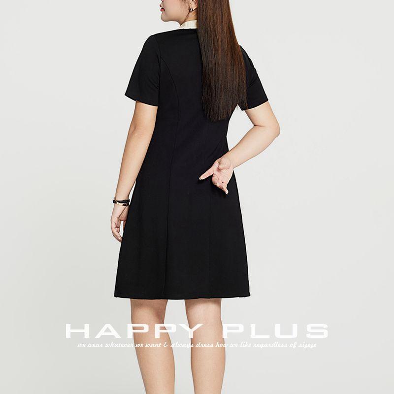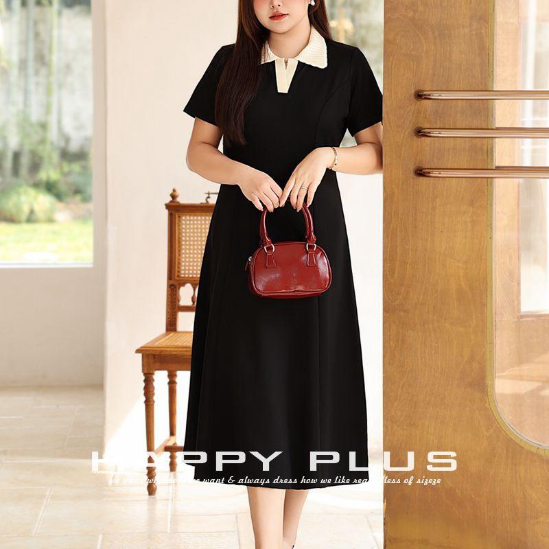 เดรสไหมพรมทรงเอไลน์สำหรับสาวอวบ สีดำ ยาว สีพื้น คอปกตัดสี คอปกพับลง เอวธรรมชาติ