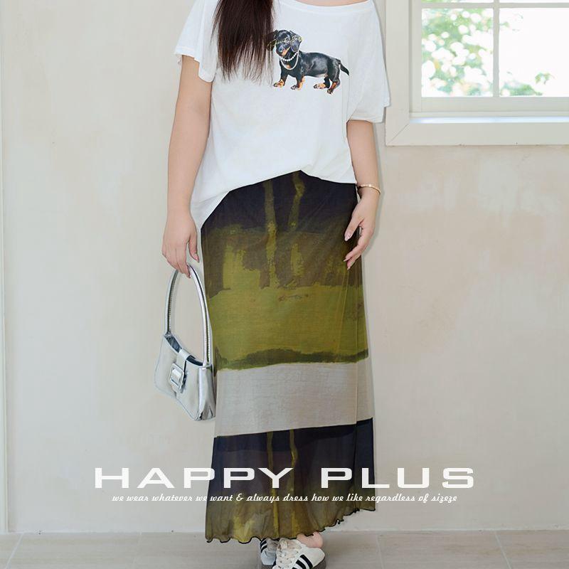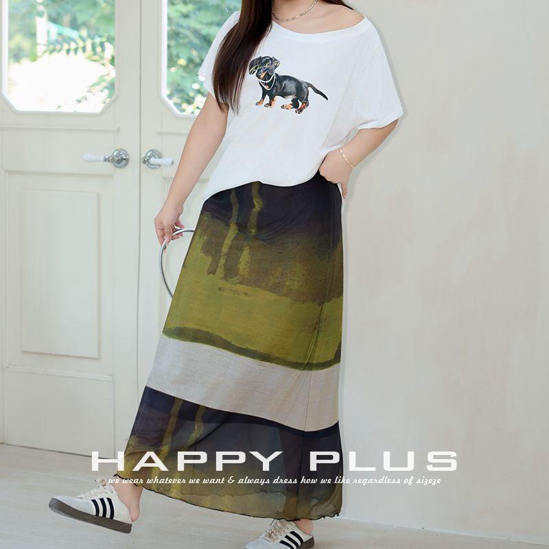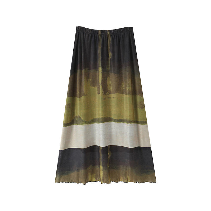 Runqi A-line Skirt Green Field Plus Size Chiffon Painting Print High Elasticity Women's Skirt N9207