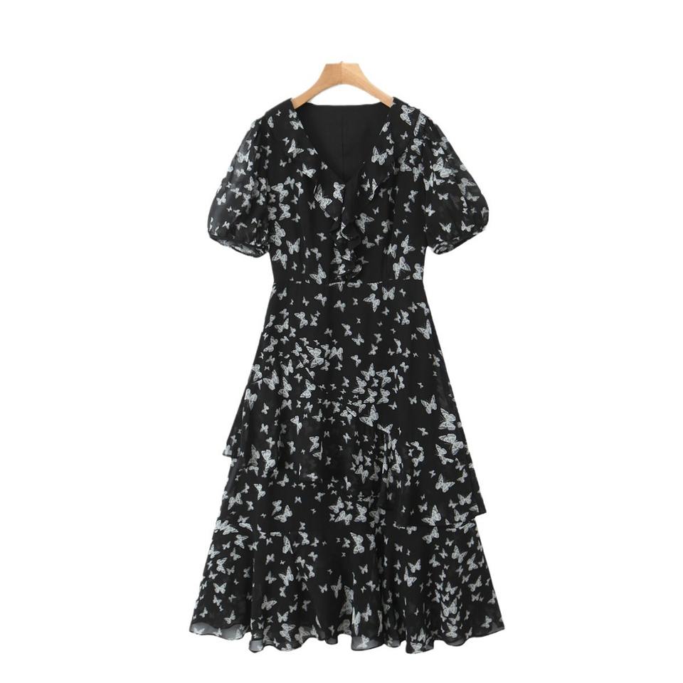 รันฉีชุดเดรสชีฟองพิมพ์ลายผีเสื้อสีดำคอวีระบายเอ-ไลน์ชุดเดรสผู้หญิงขนาดพลัส