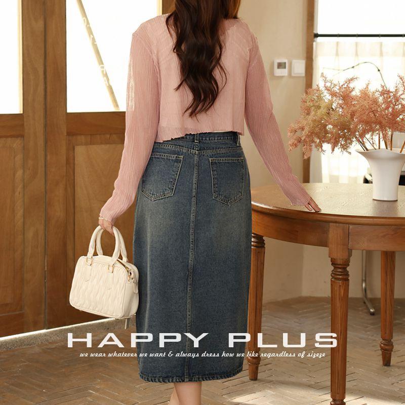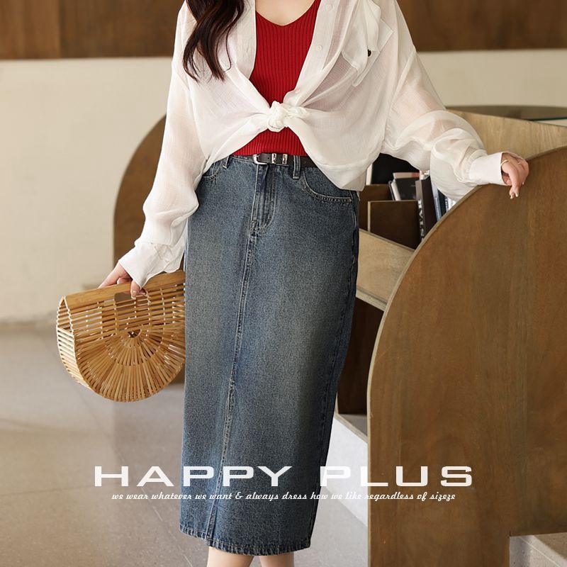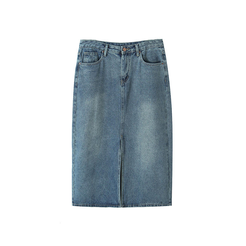รันฉี เดนิมกระโปรงยาวทรงตรงพลัสไซส์ผู้หญิงสีฟ้าสีทึบผ้าฝ้ายผ่าข้างเอวธรรมชาติ N8893