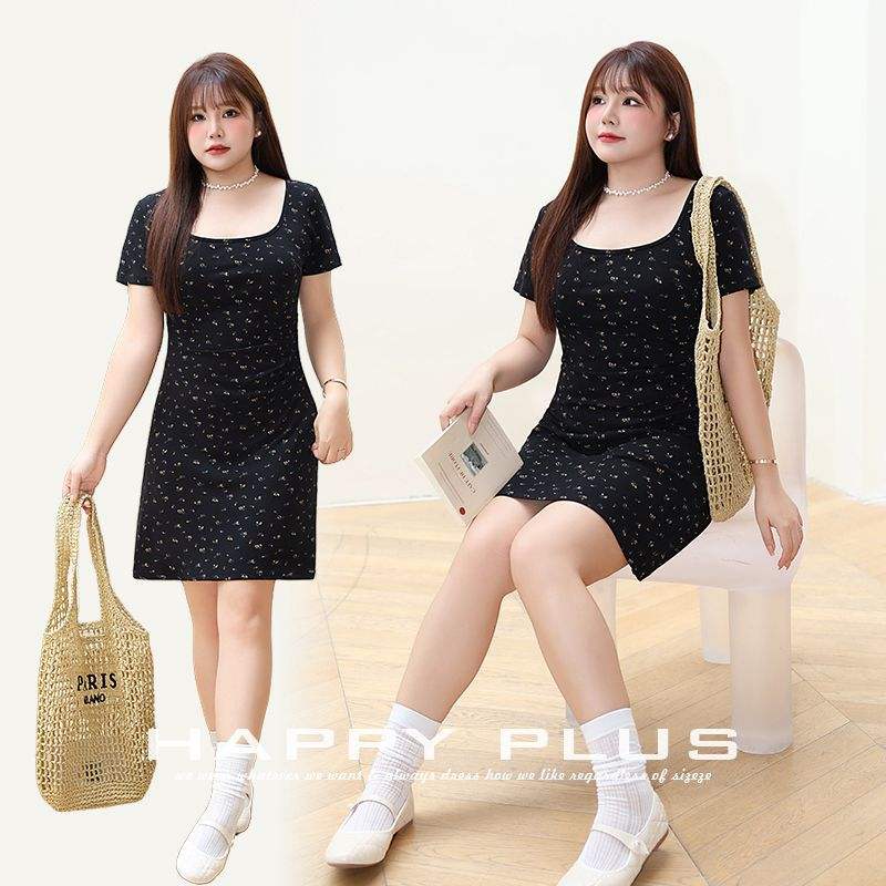 เดรสไหมพรมลายดอกไม้ คอวี แขนสั้น เอวธรรมชาติ สไตล์ลำลองสำหรับผู้หญิง ไซส์พลัส สีดำ ลายพิมพ์