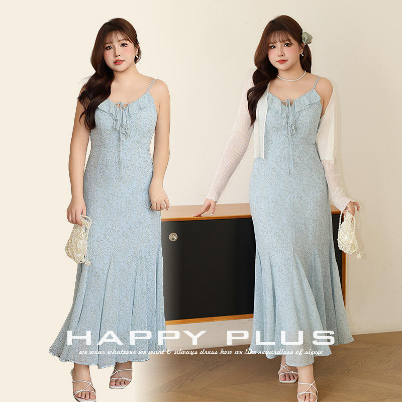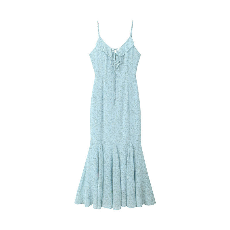 รันฉีชุดเดรสยาวลายดอกไม้สไตล์เมอร์เมด สายเดี่ยว ช่วงเอวธรรมชาติ ลายพิมพ์สีฟ้า ชุดเดรสสำหรับวันหยุด สไตล์ลำลองสำหรับผู้หญิง N8894