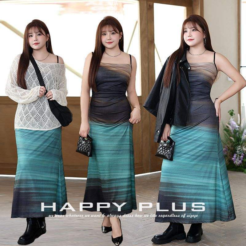 เดรสยาวทรงพลีทไล่เฉดสี Runqi สายเดี่ยว คอวี รัดเอว ไซส์ใหญ่ รุ่น N9002