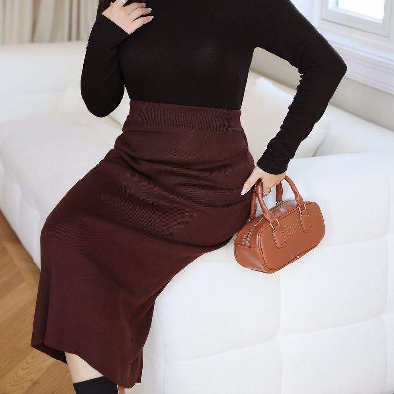 รันฉีกระโปรงถักเอวสูง N8538 สีทึบ กระโปรงยาวสีน้ำตาลสำหรับผู้หญิงฤดูใบไม้ร่วงฤดูหนาวขนาดพลัสไซส์