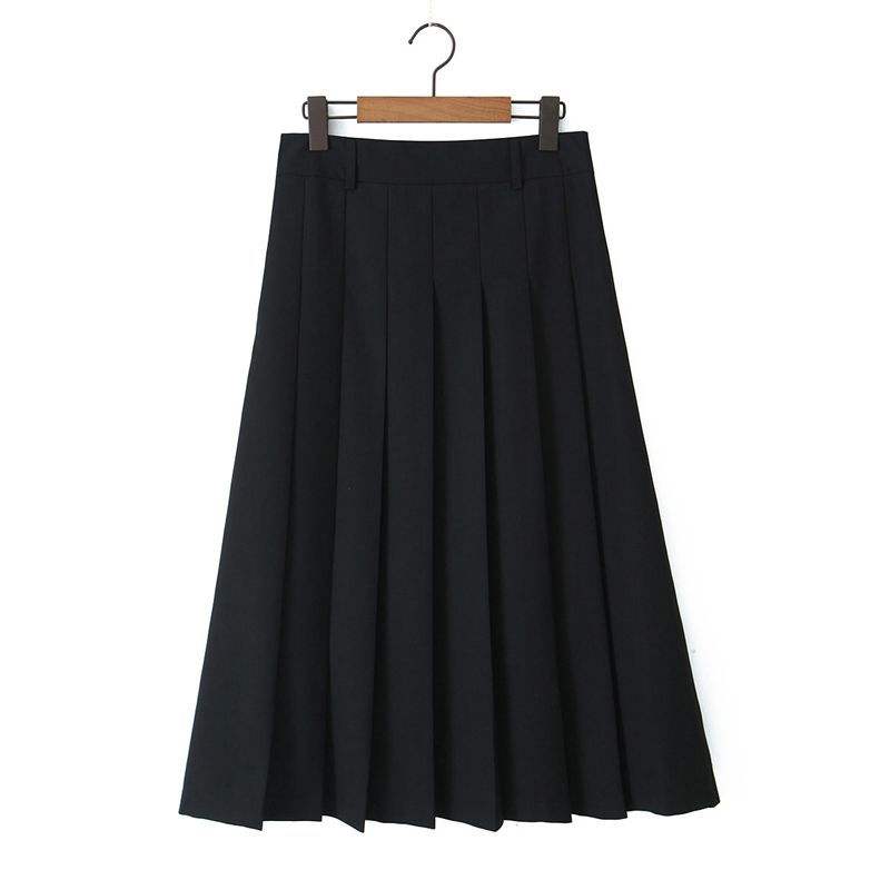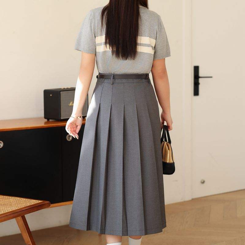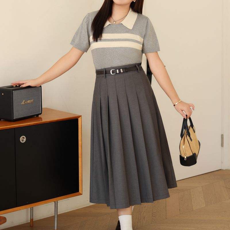 กระโปรงพลีททรงเอเอวสูง Runqi สีเทา โพลีเอสเตอร์ ไซส์พลัสสำหรับผู้หญิง พร้อมเข็มขัด และชุดเสื้อโปโล รุ่น N8857