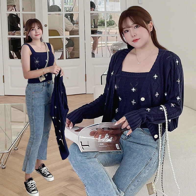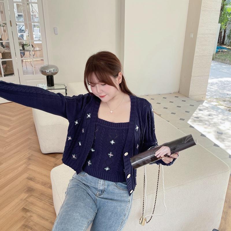 ชุดเสื้อคาร์ดิแกนถักนิตติ้งพร้อมเสื้อสายเดี่ยวสีน้ำเงินกรมท่าสำหรับผู้หญิง ชุดเสื้อสเวตเตอร์ปักลาย ไซส์พลัส