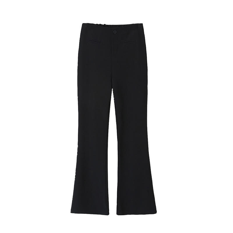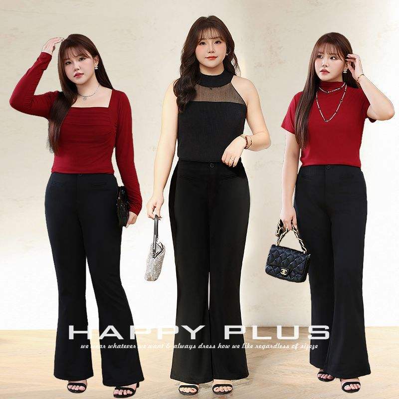 กางเกงขาบานเอวสูงผ้าถัก Runqi สีดำ ไซส์พลัสสำหรับผู้หญิง กางเกงสไตล์ OL สำหรับฤดูใบไม้ผลิ รุ่น N8816