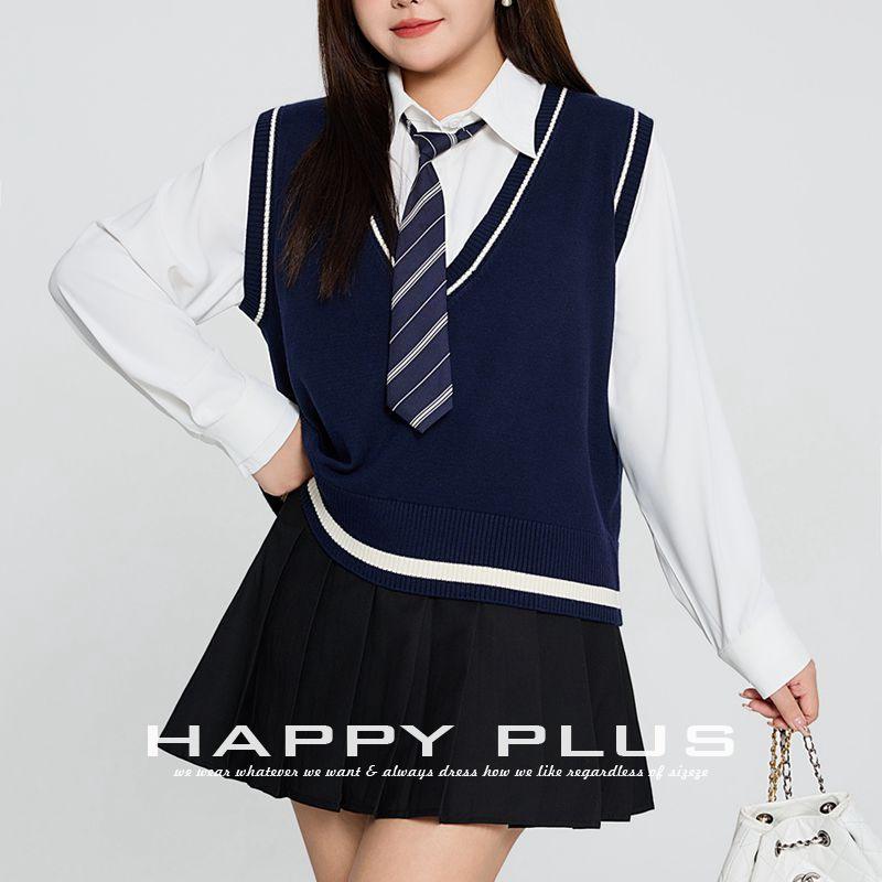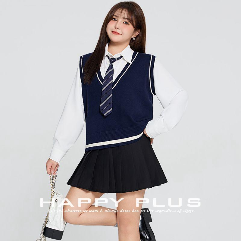 กระโปรงสั้นจับจีบสีดำ เสื้อเชิ้ตสีขาว เสื้อกั๊กถักสีน้ำเงินกรมท่า