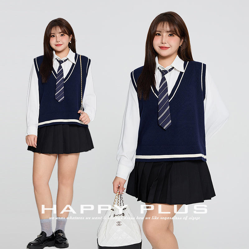 ชุดเสื้อกั๊กถัก runqi สำหรับเด็กผู้หญิงสีน้ำเงินเข้มคอวีพร้อมเสื้อสีขาวและกระโปรงจีบสีดำ N8824เครื่องแบบนักเรียน