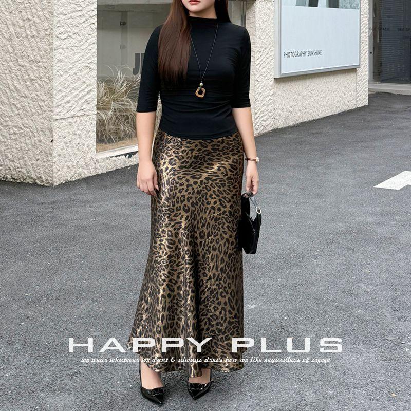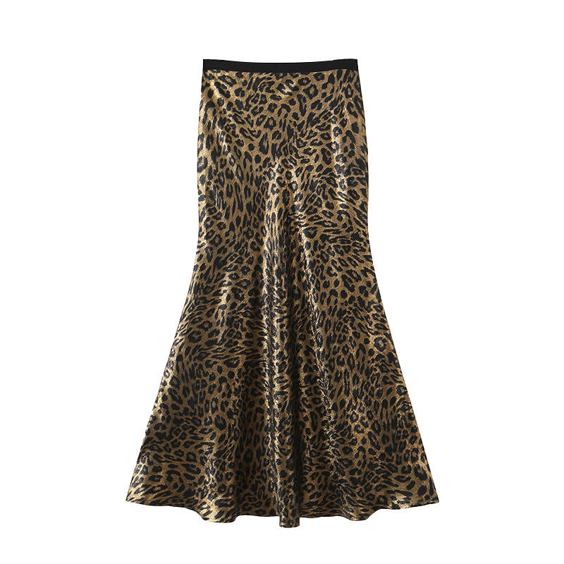 กระโปรงทรงหางปลาพิมพ์ลายเสือดาว Runqi ไซส์ใหญ่สำหรับผู้หญิง เอวธรรมชาติ สีดำทอง ผ้าโพลีเอสเตอร์ ชายกระโปรงรูปตัววี