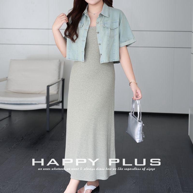 Runqi Light Blue Denim Jacket Plus Size Women's Short Sleeve Solid Color Canvas Crop Top Set