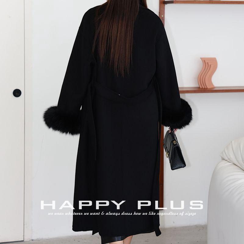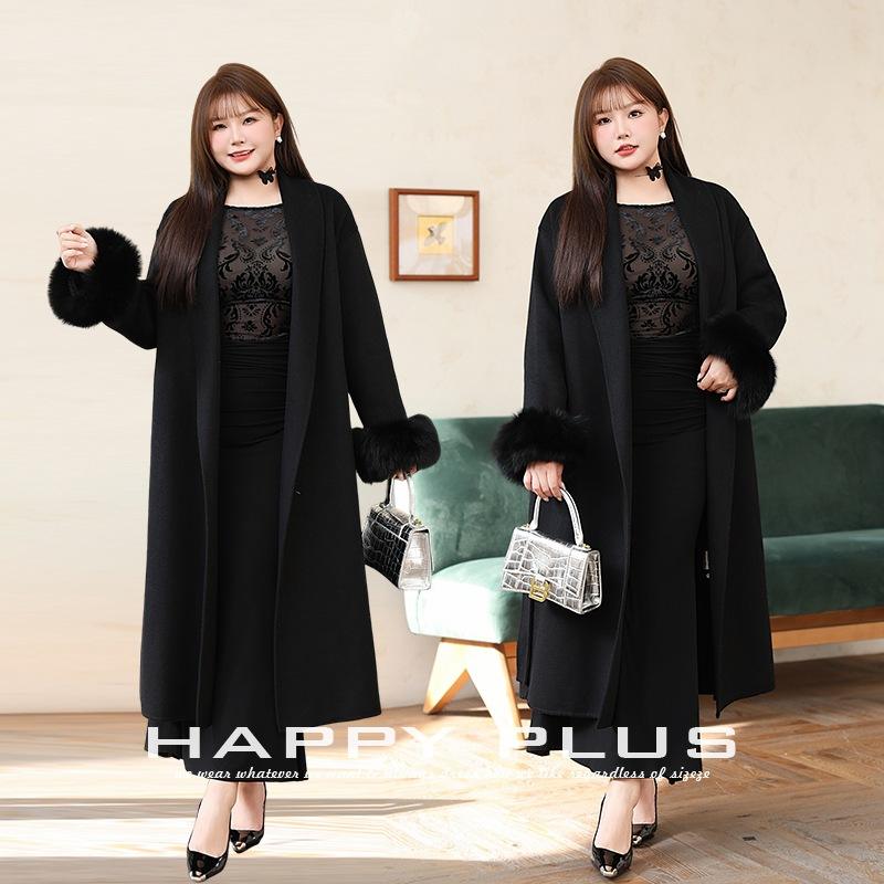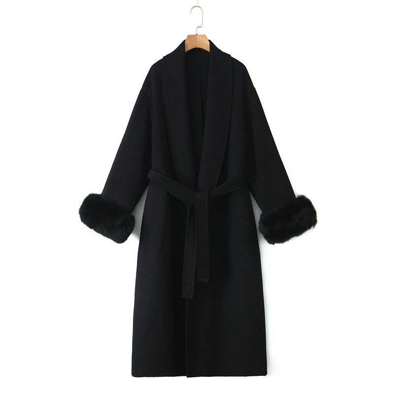 เสื้อโค้ทขนสัตว์เทียมสองด้าน Runqi Long สีดำล้วน แต่งขอบขนฟ็อกซ์ พร้อมเข็มขัด ให้ความอบอุ่น หรูหรา สำหรับผู้หญิง