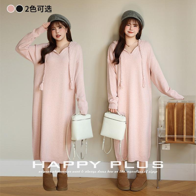 เดรสไหมพรมมีฮู้ดทรงหลวมสำหรับผู้หญิงไซส์ใหญ่ สีพื้น แขนยาว พร้อมป้ายและแท็ก