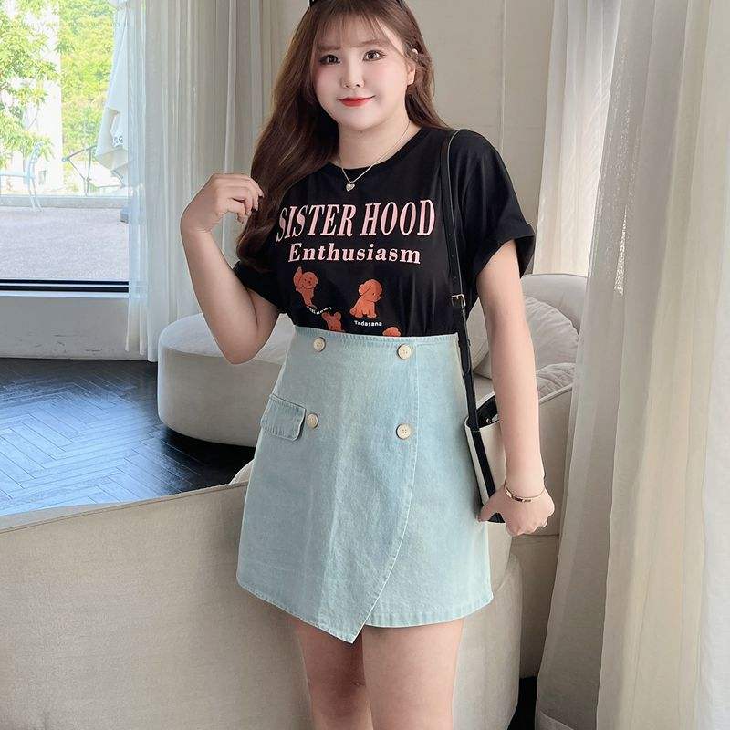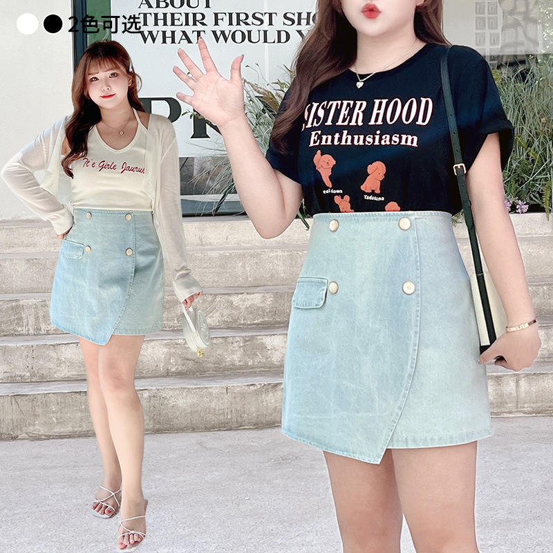 กระโปรงยีนส์เอวสูงทรงเอไลน์แบบไม่สมมาตร รุ่น Runqi N7583 สีพื้น ไซส์พลัสสำหรับผู้หญิง