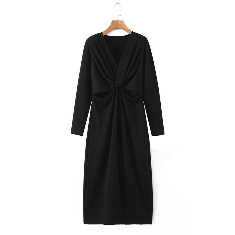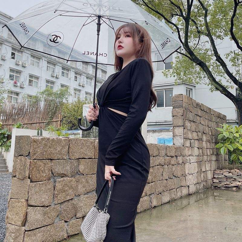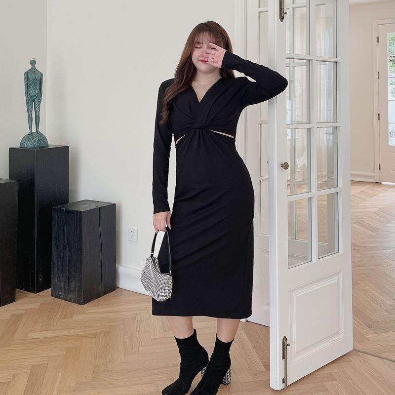 เดรสทรงเข้ารูปคอวี รุ่น Runqi N8243 สีดำ ไซส์พลัส ดีไซน์เว้าช่วงเอว เดรสออกงานกลางคืนสำหรับผู้หญิง สีพื้น ทรงเข้ารูป