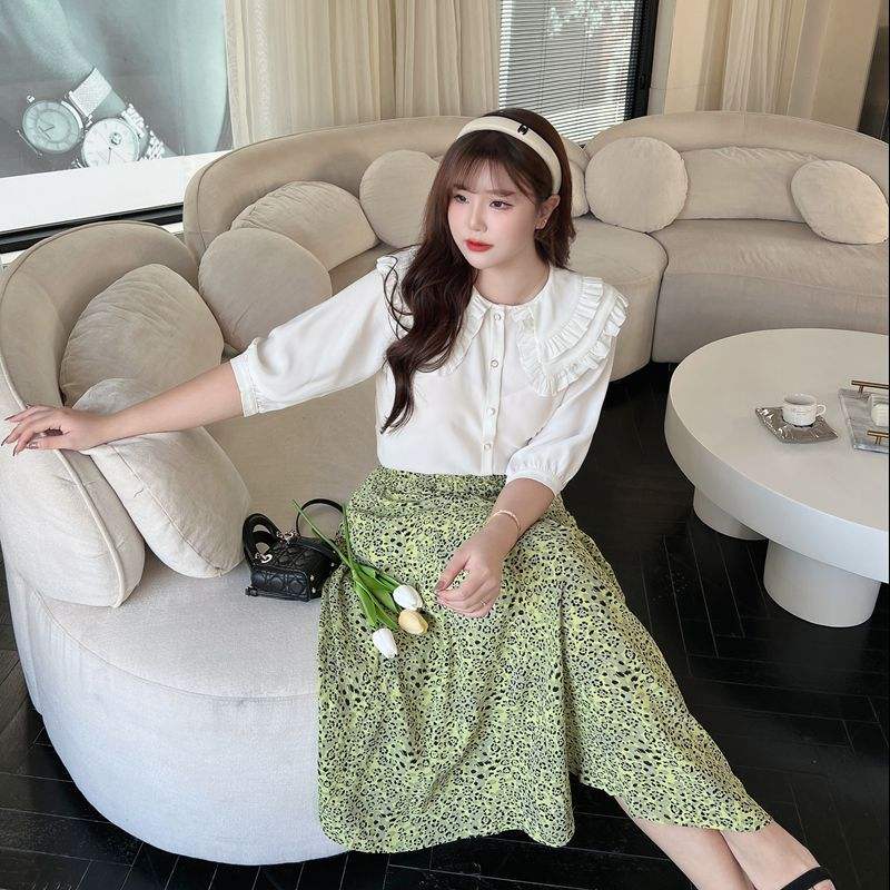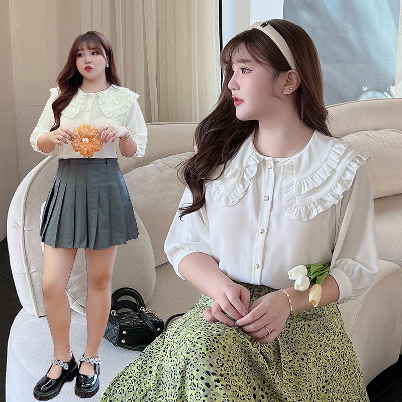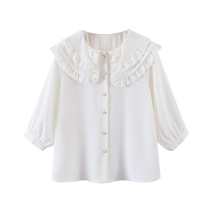 รันฉี เอ็น8274 เสื้อชีฟองผู้หญิง สีขาวล้วน คอปีเตอร์แพน แต่งระบาย แขนสั้น ใส่ได้ทุกวัน