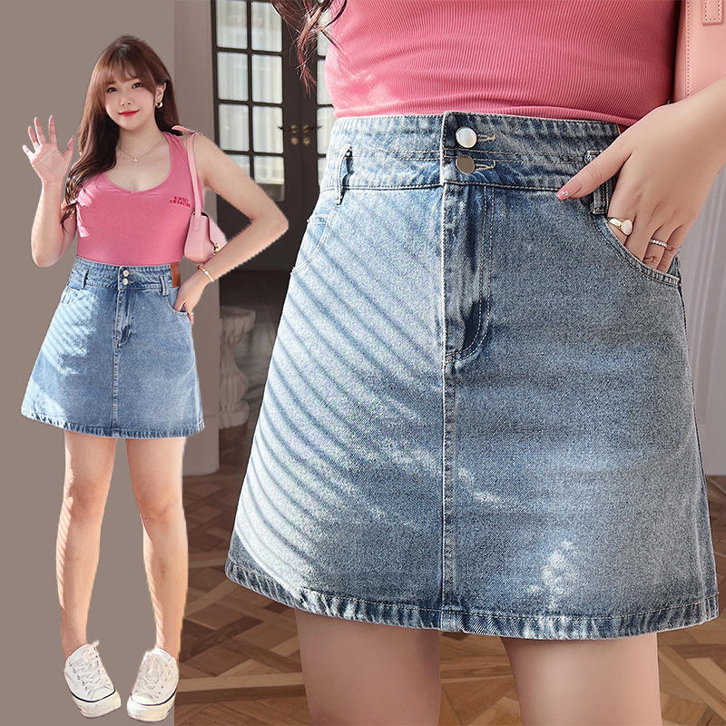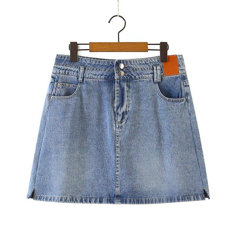 กระโปรงยีนส์ทรงเอเอวสูงไซส์ใหญ่ รุ่น Runqi N8325 พร้อมกระดุมสองเม็ดและกระเป๋าสำหรับผู้หญิง สีน้ำเงินเดนิม ผ้าฝ้าย สไตล์เรียบง่าย