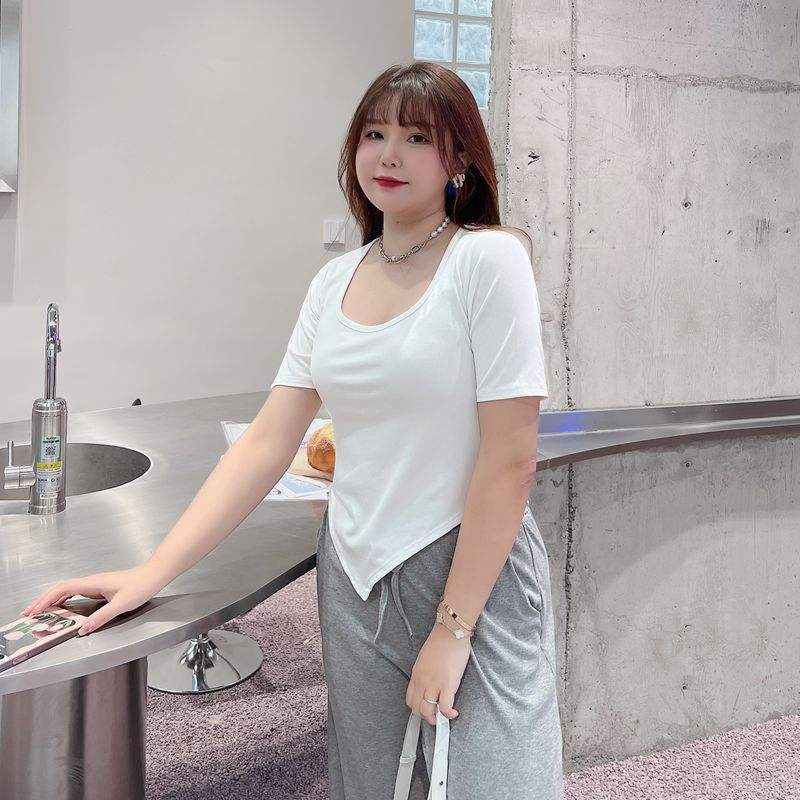 เสื้อท็อปผู้หญิง Runqi N8366 สีดำ คอเหลี่ยม ทรงเอซิมเมตริก ผ้าโมดอล แขนสั้น ไซส์พลัส สีพื้น เรียบง่าย สวมใส่สบาย