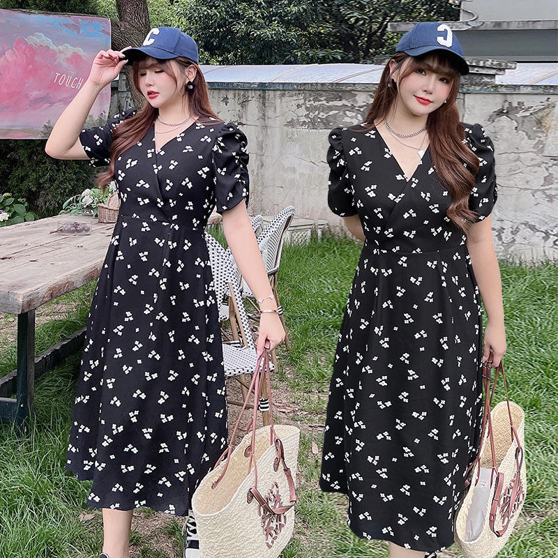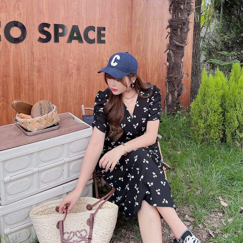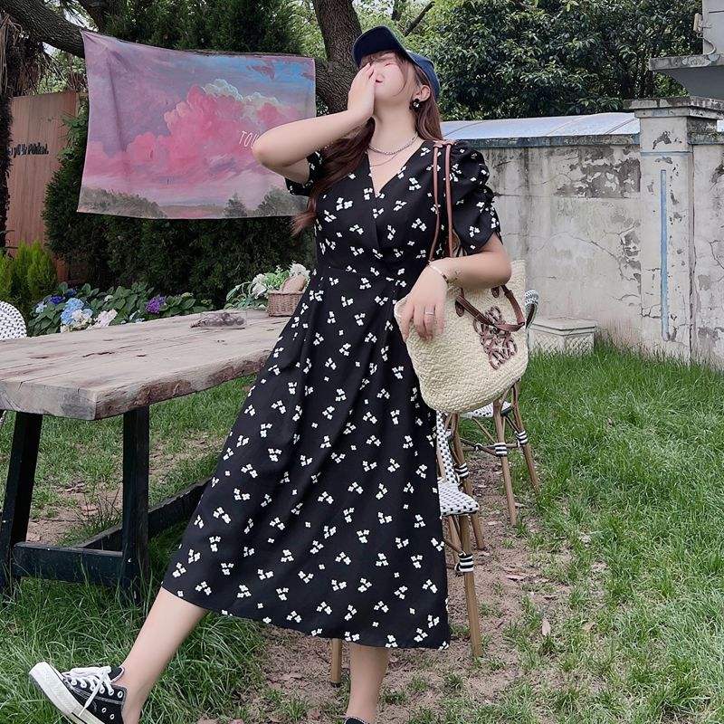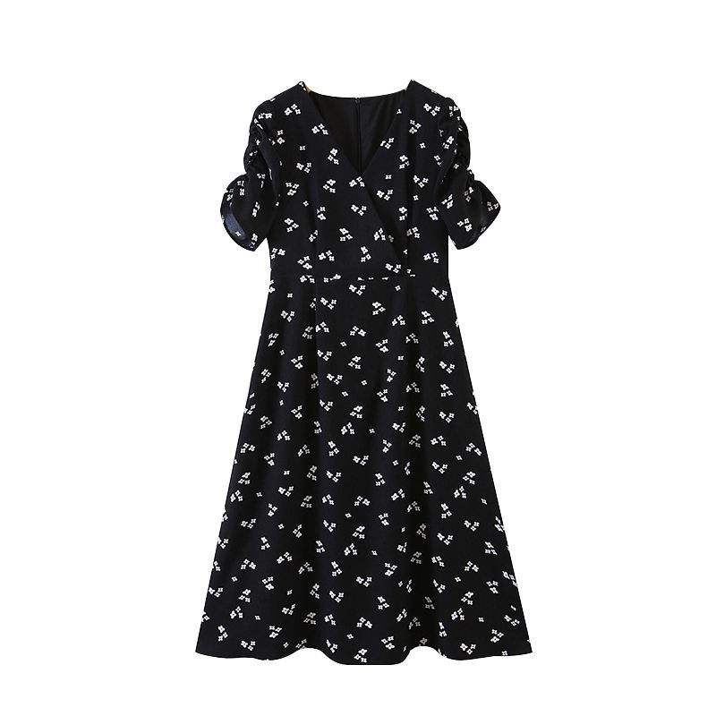 เดรสลายดอกคอวี รุ่น Runqi N8416 สีดำ แขนสั้น เอวธรรมชาติ สไตล์ลำลองสำหรับผู้หญิง ใส่ได้ทุกวัน สำหรับฤดูร้อน