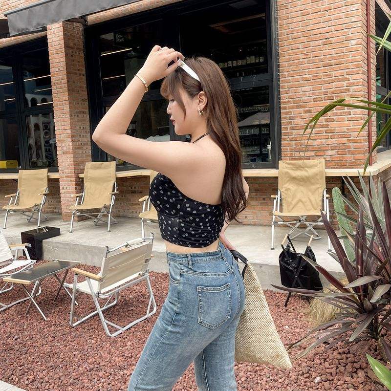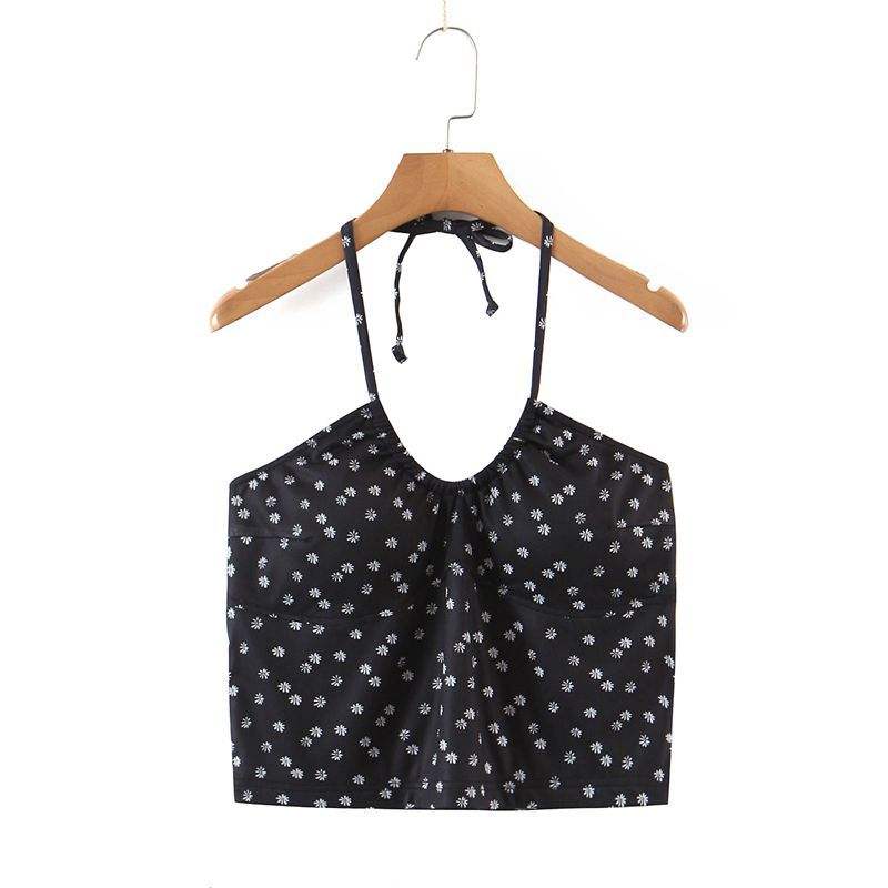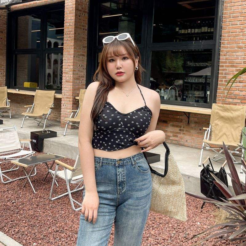 เสื้อกล้ามคอ halter ลายดอกไม้ Runqi N8441 สีดำ ไซส์พลัส เปิดหลัง สไตล์ลำลองสำหรับผู้หญิง ใส่ได้ทุกวัน