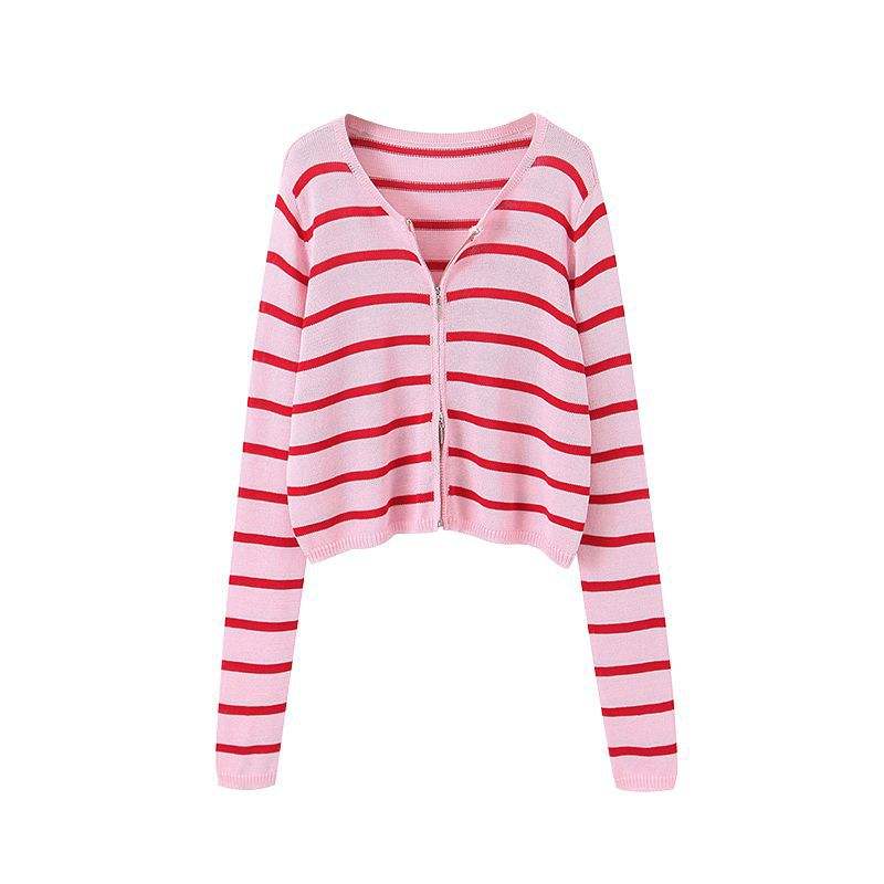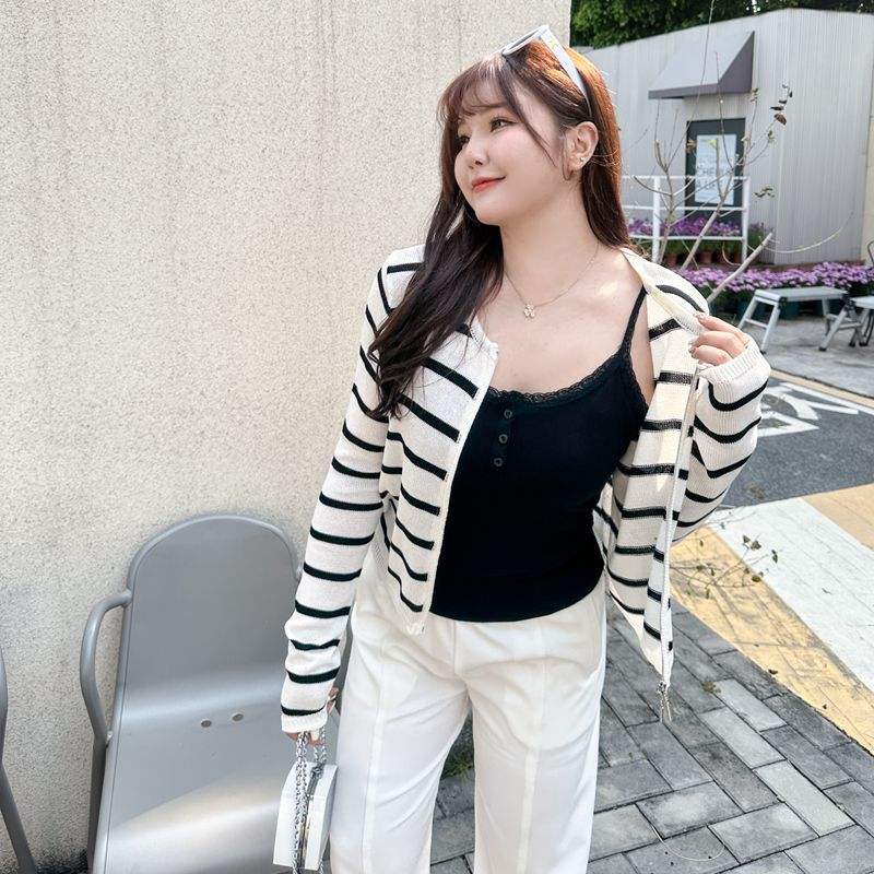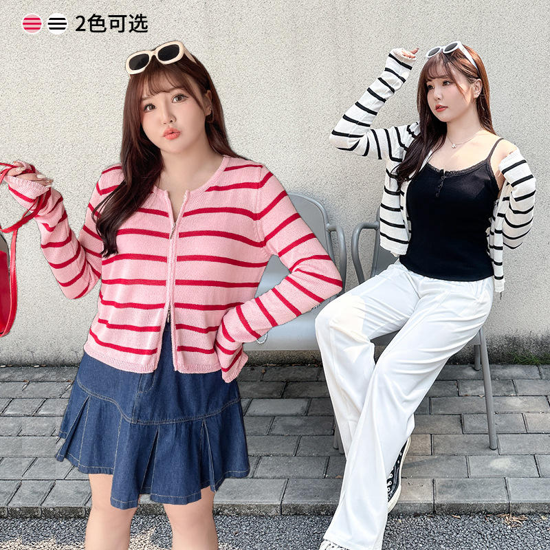 เสื้อคาร์ดิแกนถักลายทางรุ่น Runqi N8641 สำหรับผู้หญิงไซส์พลัส แขนยาว ผ้าบาง ดีไซน์ซิปตัดสี แฟชั่นเสื้อแจ็คเก็ตสเวตเตอร์