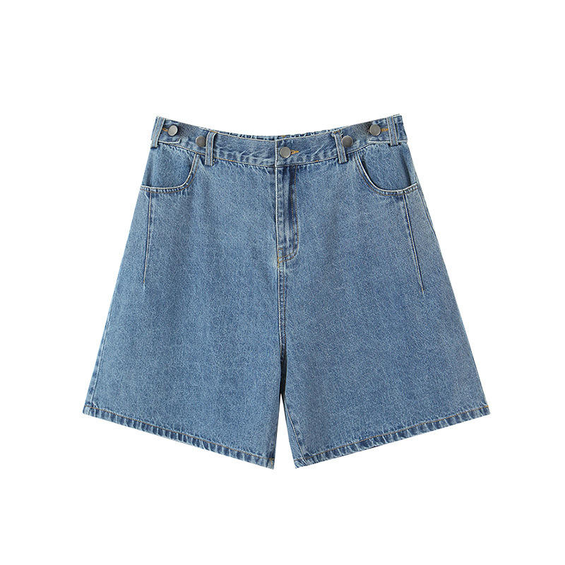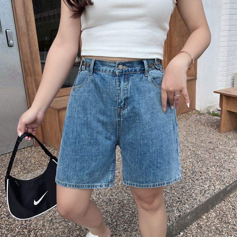 Runqi N8686 High Waisted Straight Leg Denim Shorts For Women Plus Size Cotton Blue And Black Medium Thickness Micro Elasticity