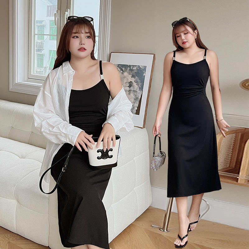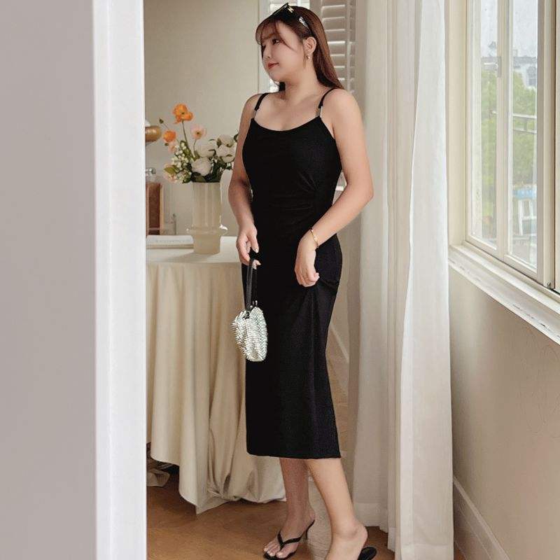 เดรสสายเดี่ยวสีดำรัดรูปทรงพลีทเอวสูง รุ่น Runqi N8703 Plus Size สำหรับผู้หญิง สีพื้น เอวธรรมชาติ