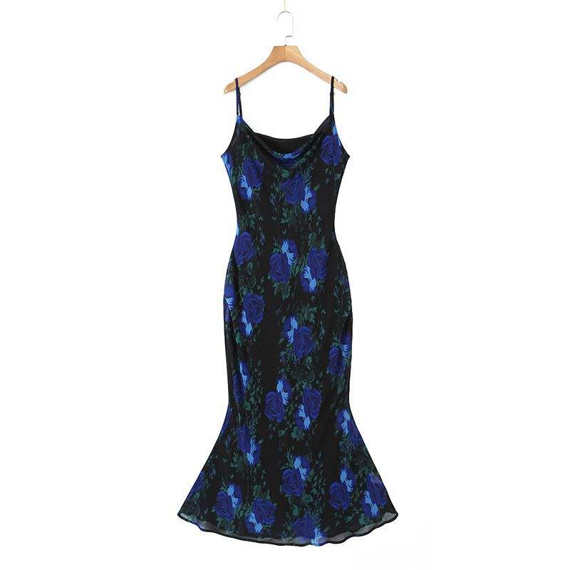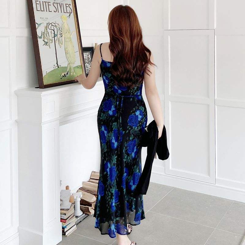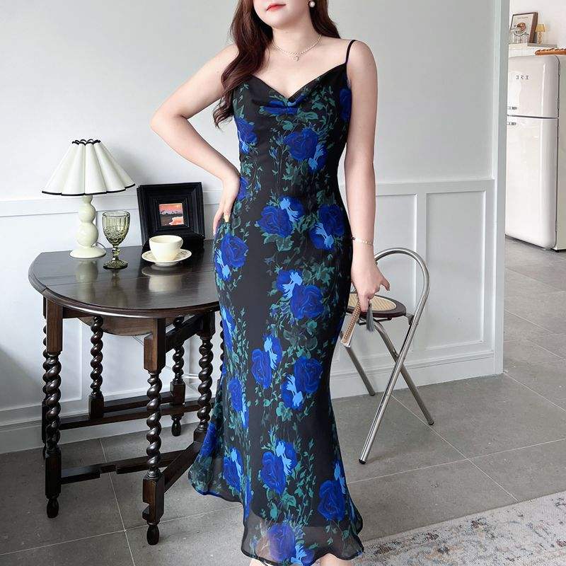 เดรสยาวลายดอกไม้สีดำน้ำเงิน รุ่น Runqi N8745 คอวัว ทรงบิแอสคัท ชุดราตรีสำหรับผู้หญิง ไซส์พลัส ชุดเดรสสายเดี่ยวลายดอกไม้
