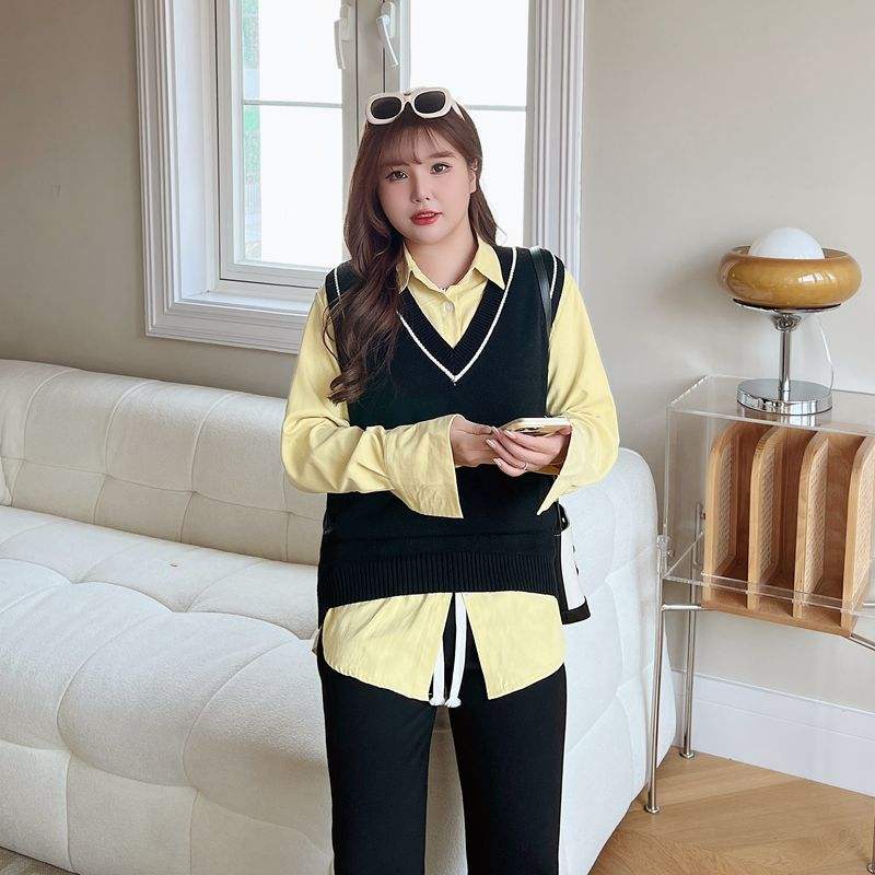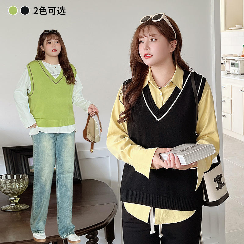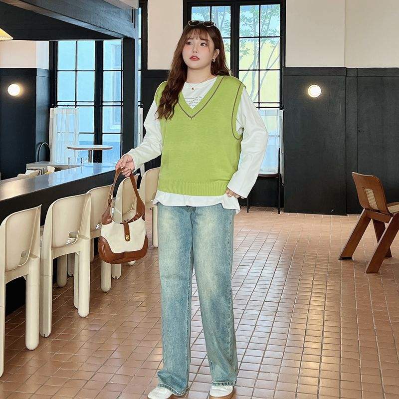 เสื้อถักกันหนาวคอวีสำหรับผู้หญิงขนาดใหญ่พิเศษ N8754 Runqi สีเขียวอ่อนสไตล์ญี่ปุ่นทรงหลวม
