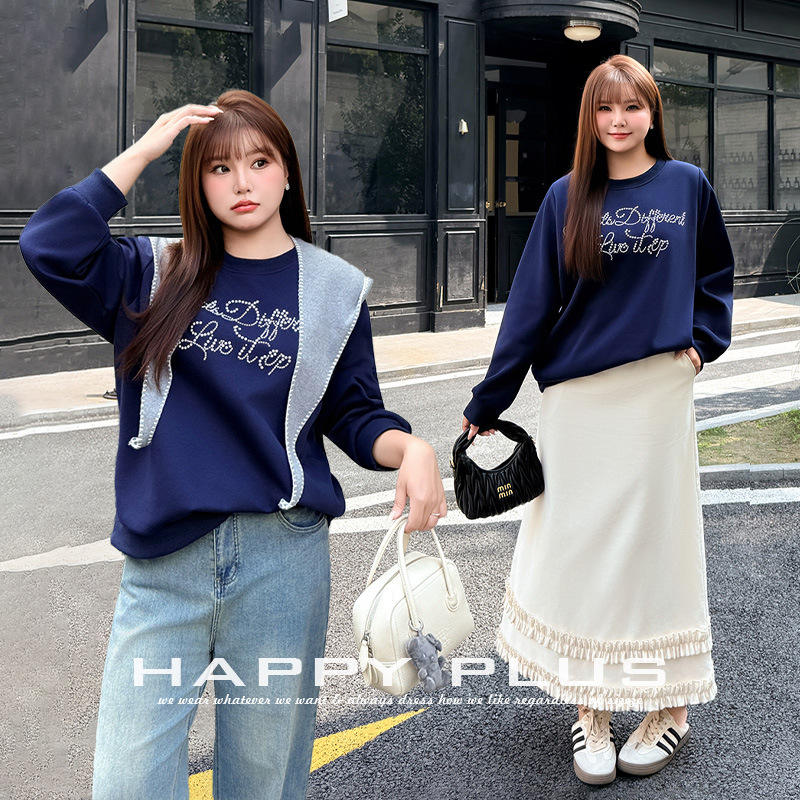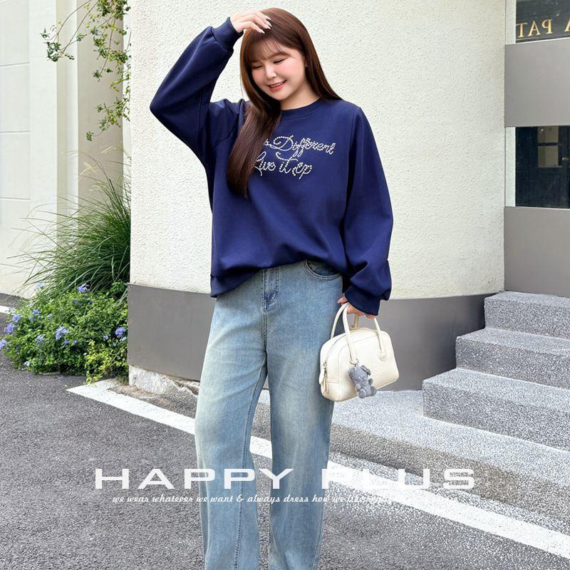 เสื้อสเวตเชิ้ตสีน้ำเงินกรมท่าขนาดใหญ่พิเศษ รุ่น Runqi ประดับมุกและคริสตัล ทรงหลวมสำหรับผู้หญิง เสื้อถักผ้าฝ้าย