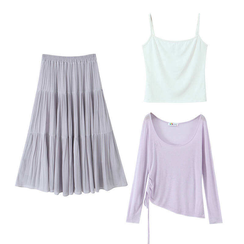 กระโปรงมิดิสีม่วงในฝัน, เสื้อสายเดี่ยวสีขาว, เสื้อคลุมสีม่วงสี