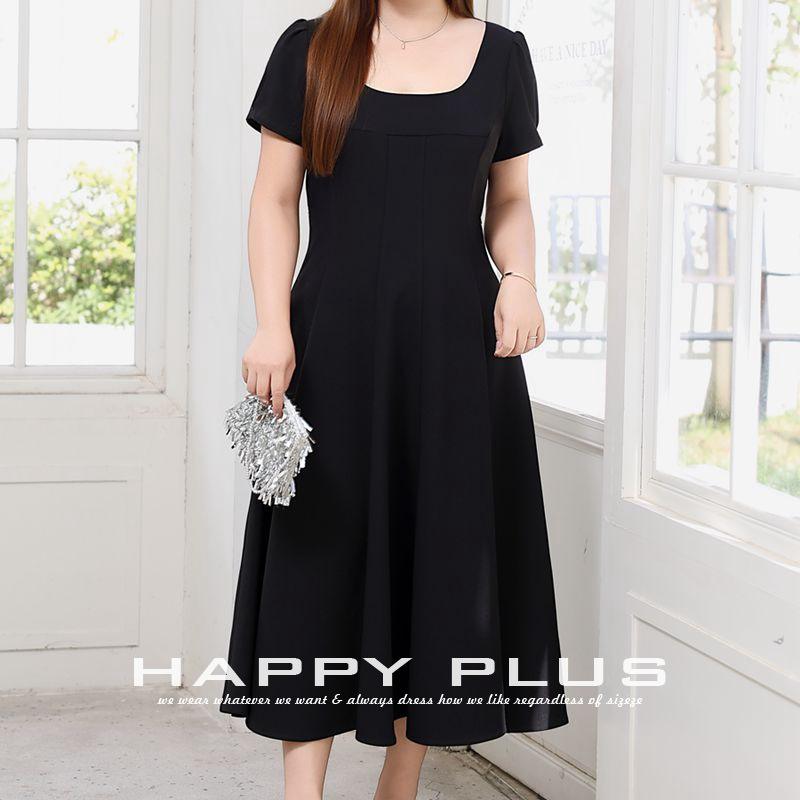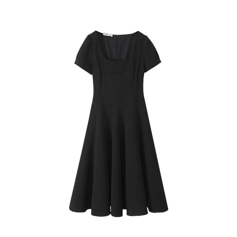 รันฉี ชุดเดรสทรงเอสำหรับผู้หญิงไซส์ใหญ่ คอเหลี่ยม แขนสั้น สีพื้น สีดำ ดีไซน์เว้าช่วงเอว รุ่น N9244