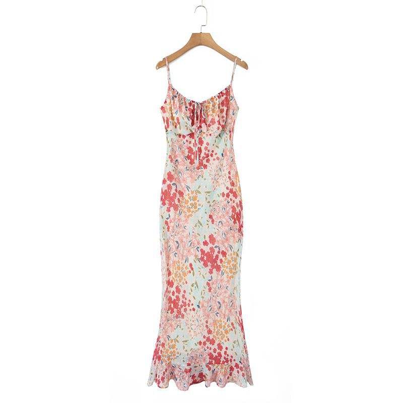 รันฉีชุดเดรสผู้หญิงไซส์ใหญ่พิมพ์ลายดอกไม้ ชุดเดรสทรงทรัมเป็ตเอวธรรมชาติ สีชมพู รุ่น N9268
