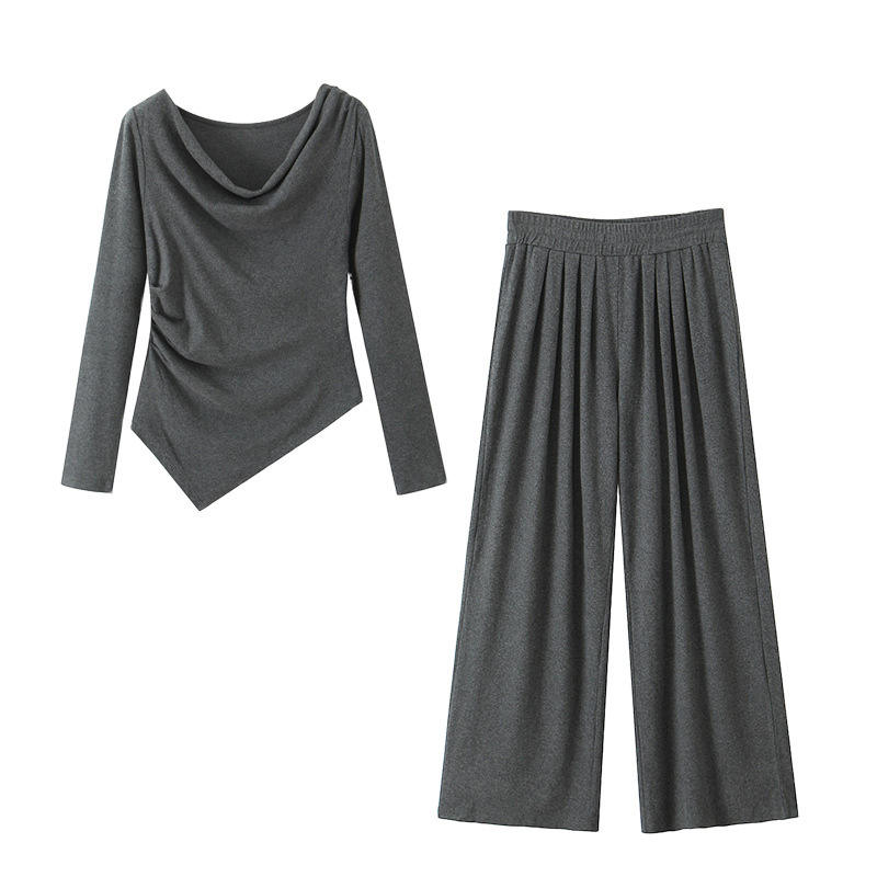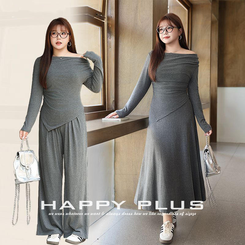 ชุดเซ็ตเสื้อถักสีเทาและกางเกงขายาวทรงกว้างสำหรับผู้หญิงไซส์ใหญ่ รุ่น Runqi กระโปรงจีบเอวเข้ารูป แขนยาว สีพื้น เหมาะสำหรับใส่ไปทำงาน