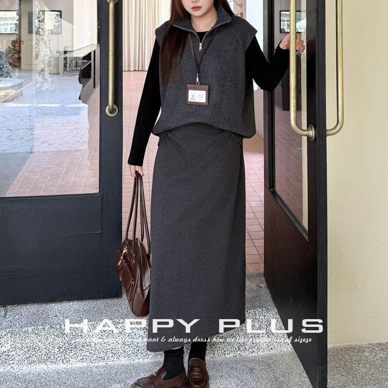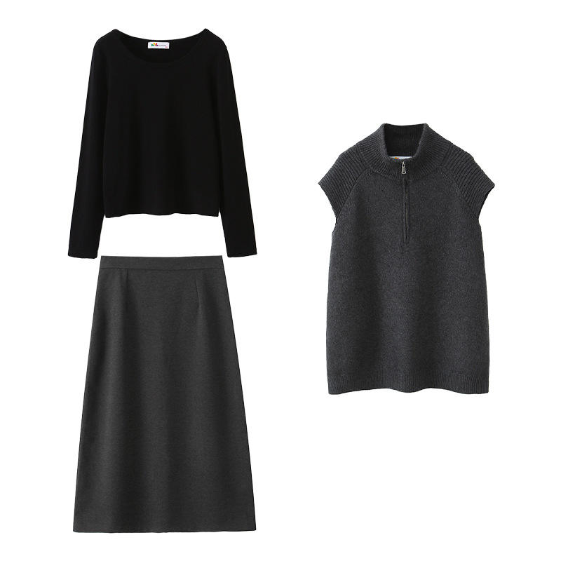 เสื้อกั๊กสีเทาเข้ม เสื้อแขนยาวสีดำ กระโปรงสั้นสีเทาเข้ม