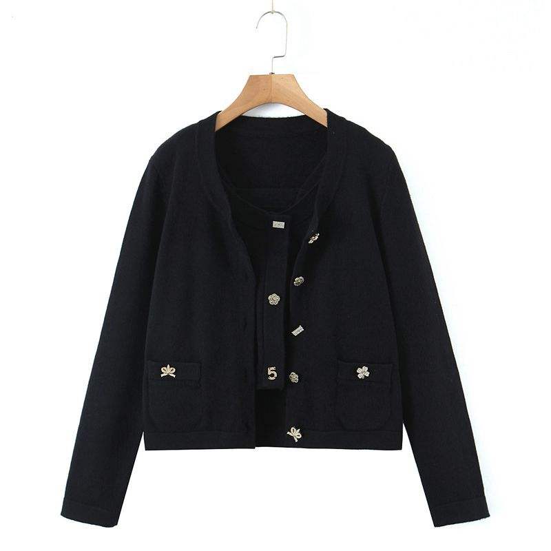 ชุดถักนิตติ้งสำหรับผู้หญิงไซส์ใหญ่ Runqi สีดำ เสื้อคลุมคาร์ดิแกนและเสื้อสายเดี่ยวลายดอกไม้ ติดกระดุม สไตล์หรูหรา สำหรับผู้ใหญ่