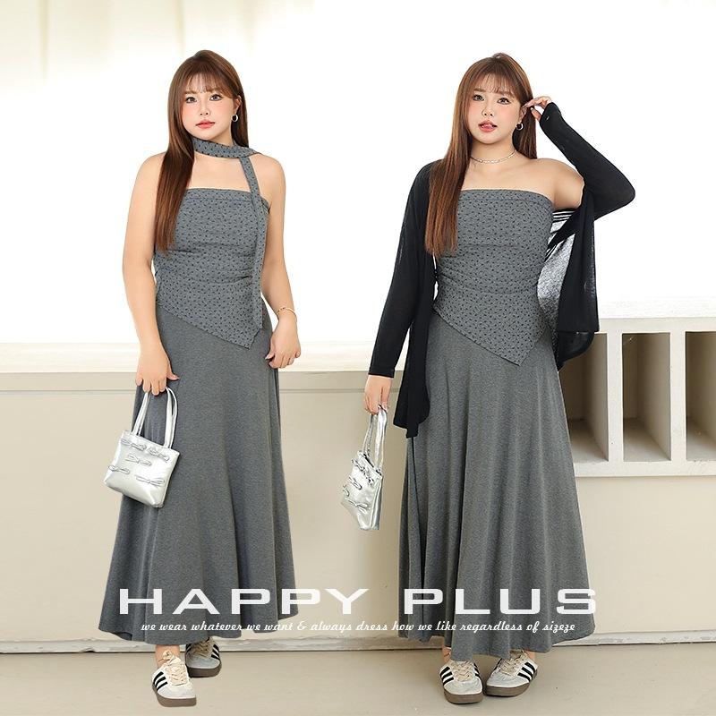 รันฉีชุดเซ็ตสามชิ้นสำหรับผู้หญิงไซส์พลัส เสื้อเกาะอกสีเทา กระโปรงยาวปานกลาง เสื้อคลุมสีดำลายดอกไม้แบบอสมมาตร