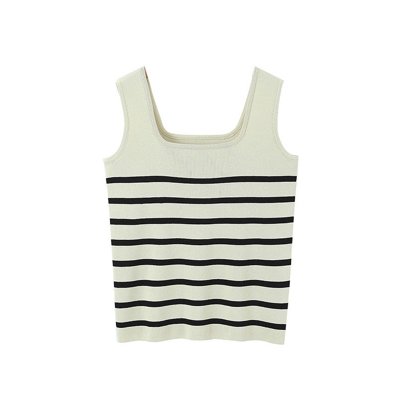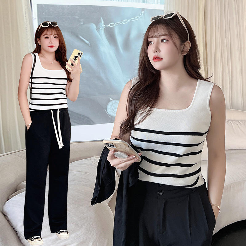 เสื้อกั๊กถักคอเหลี่ยม Runqi รุ่น N8651 ลายทางสีขาว ไซส์พลัส เสื้อสเวตเตอร์ผู้หญิง สไตล์พื้นฐาน เสื้อสายเดี่ยวสำหรับผู้ใหญ่