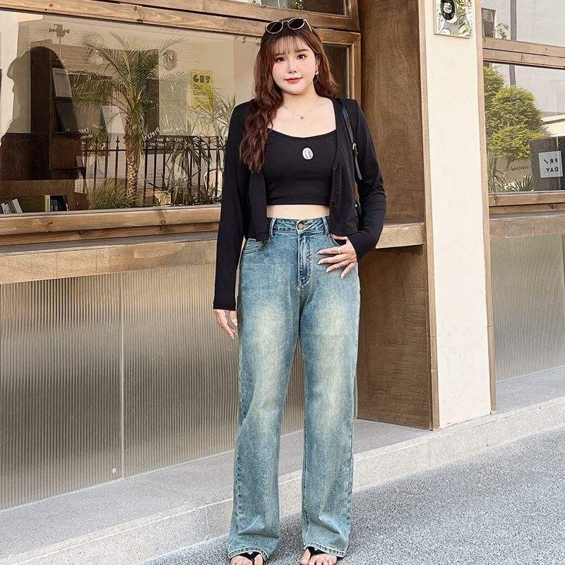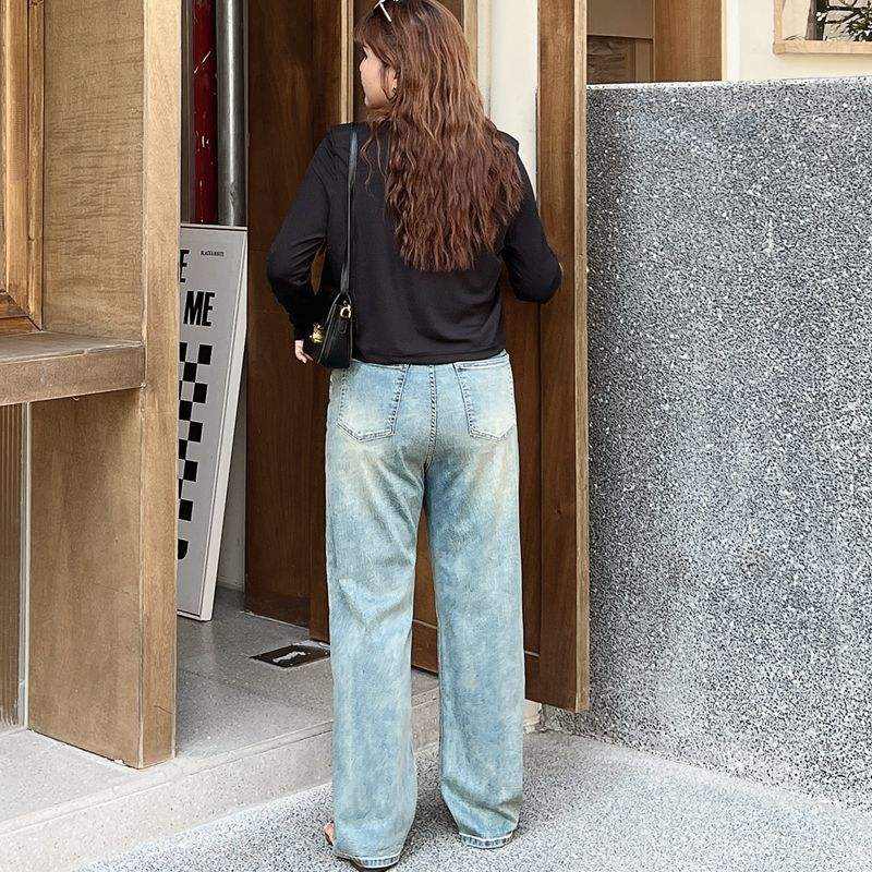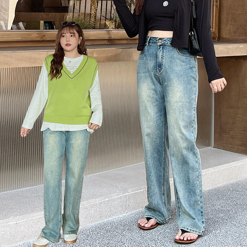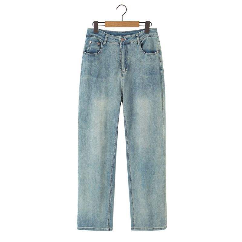 กางเกงยีนส์ขาตรงรุ่นรันฉีสีน้ำเงินเรโทรสำหรับผู้หญิงไซส์ใหญ่ ผ้าฝ้ายผสม ซิปตกแต่ง รุ่น N8753