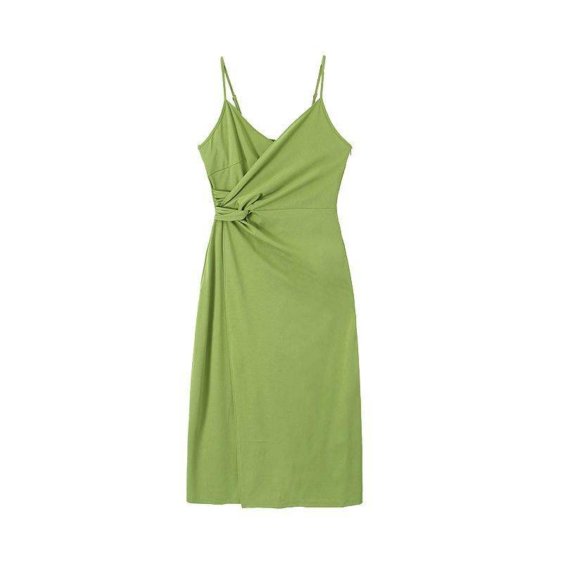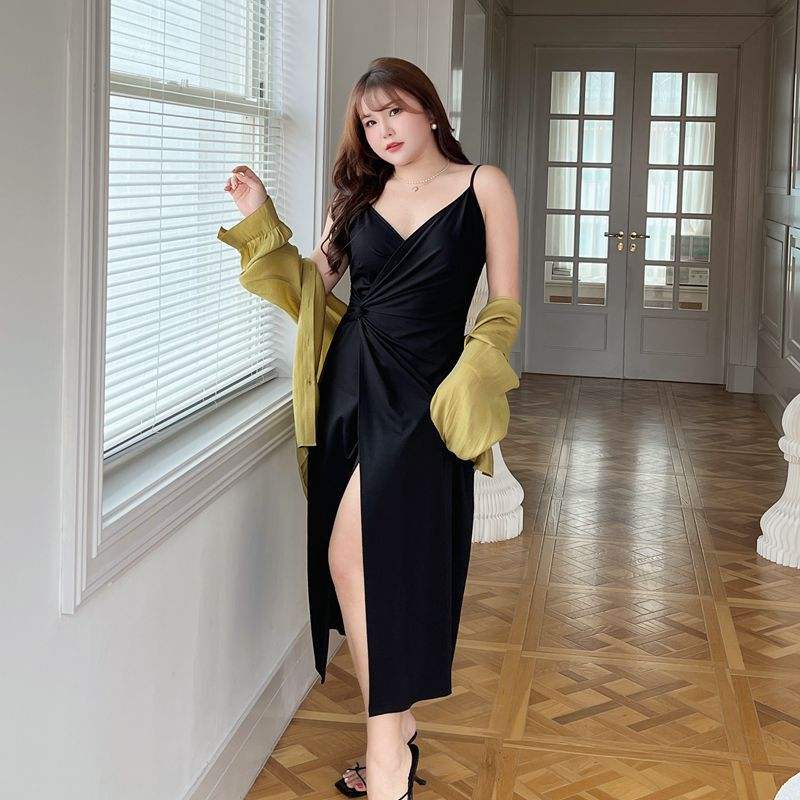 เดรสยาวปานกลางทรงวีคอ คอวี ผ่าเอว แต่งระบาย สำหรับผู้หญิงไซส์พลัส ใส่สบาย เปิดหลัง เดรสออกงาน เอวเข้ารูป